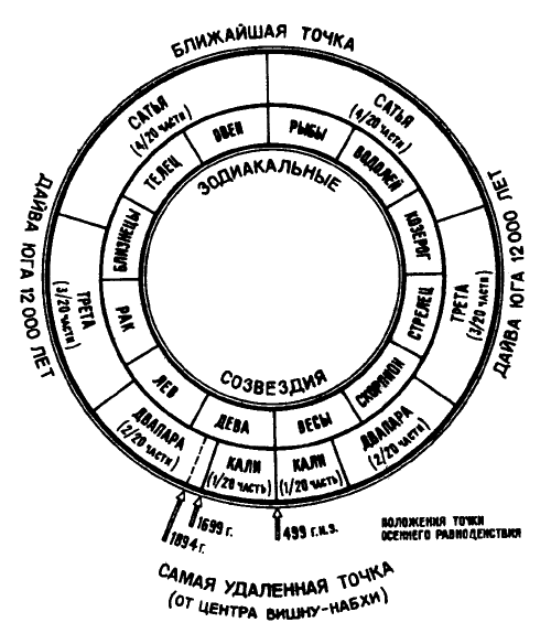 Сначала несколько вводных слов. Для каждого изучаемого объекта можно установить множество циклов разной длительности. Каждый цикл обусловлен движением объекта вокруг некоторого центра, при этом орбита объекта эллиптическая, а центр находится в одном их фокусов эллипса. При прохождении объекта по орбите есть точка его максимального приближения к центру (перицентр) и точка максимального удаления от центра (апоцентр). Схематически это выглядит так: Вложение 3200 Перицентр Вложение 3201 Апоцентр В перицентре объект максимально напитывается энергией центра (это пик Сатья-Юги, если центр светлый), в апоцентре энергия центра максимально теряется объектом (это пик Кали-Юги). Реально каждый объект участвует в множестве вращений: он вращается вокруг некоторого центра, этот центр (вместе с объектами своей системы) вращается вокруг своего центра, последний — вокруг своего и т.д. Так рождается множество вложенных циклов. Теперь обратимся к выдержкам из книги Свами Шри Юктешвары Гири «Святая наука», написанной в 1894 году: Цитата: