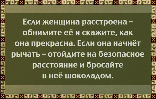 ...У меня жена лежит в больнице. Так вот. После работы заехал в магазин. Купил еды. Приехал домой. Убрал за котом. Встретил дитё со школы. Помог сделать уроки. Приготовил поесть. Накормил всех. Пробежался с пылесосом. Помыл посуду. Уложил мелочь спать. Накормил кота. Зарядил стирку. Везде прибрался. Ни телек ни комп даже не включал. Прилёг. Час ночи. Ни рук ни ног. Спина болит. Завтра рано вставать и вести детей на тренировку. Представил ситуацию: В дверь вваливается пьяная жена из бара с парой пива под мышкой. Врубает телек, гремит кастрюлями, ищща пожрать. Пьет пиво, курит на кухне, ржот. Потом идёт в спальню и пытается, воняя перегаром и табачищем, ко мне приставать. ПРИБИЛ БЫ НЕ ДУМАЯ!!!!!
