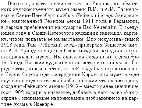 Живая Этика (Агни Йога), Теософия | | | Результаты поиска в Google | | | Результаты поиска по Агни Йоге | | | 04.12.2016, 08:30 | #1441 | Рег-ция: 23.02.2013 Сообщения: 764 Благодарности: 133 Поблагодарили 419 раз(а) в 344 сообщениях | Ответ: Обновление галереи картин Н.К. Рериха Цитата: Сообщение от Владимир Чернявский "Заморские гости" - может в заголовок вынести, что это эскиз? Музей атрибутирует технику как: " Бумага, акварель, тушь, гуашь". И " До 1901 года". | Перенести из примечания в подзаголовок можно. А вот в каком издании МУЗЕЙ так утверждает? На данный момент найдено лишь одно музейное издание: "Заморские гости. Бумага, акварель. 11,0 х 13,2. Уфа, Башкирский гос. худ. музей им. М.В. Нестерова" (Башкортостан-Индия. Традиции и современность. Уфа: Гилем, 2005). Даже на сайте музея нет данных (других). А не музейным сайтам я не верю. | | | 04.12.2016, 08:58 | #1442 | | Administrator Рег-ция: 14.12.2002 Адрес: Москва Сообщения: 44,905 Благодарности: 1,988 Поблагодарили 7,073 раз(а) в 4,822 сообщениях | Ответ: Обновление галереи картин Н.К. Рериха Цитата: Сообщение от Gallery А вот в каком издании МУЗЕЙ так утверждает? На данный момент найдено лишь одно музейное издание: "Заморские гости. Бумага, акварель. 11,0 х 13,2. Уфа, Башкирский гос. худ. музей им. М.В. Нестерова" (Башкортостан-Индия. Традиции и современность. Уфа: Гилем, 2005) | Есть и другие издания. К примеру: "Шедевры музейных коллекций. Уфа" (2005). С большой вероятностью данные взяты из музейной атрибутивной карточки. ------------------------------ | | | 04.12.2016, 13:44 | #1443 | Рег-ция: 23.02.2013 Сообщения: 764 Благодарности: 133 Поблагодарили 419 раз(а) в 344 сообщениях | Ответ: Обновление галереи картин Н.К. Рериха Спасибо за фото из "Шедевры". Издатель солидный и, несомненно, пользовался музейными сведениями. В оставшемся в рукописи каталоге Иванова в 1900 есть: "Заморские гости, 1-й эскиз (акв.) [владелец] М.В.Нестеров", что позволяет не гадать, а точно ставить год. | | | | Этот пользователь сказал Спасибо Gallery за это сообщение. | | 04.12.2016, 18:51 | #1444 | | Administrator Рег-ция: 14.12.2002 Адрес: Москва Сообщения: 44,905 Благодарности: 1,988 Поблагодарили 7,073 раз(а) в 4,822 сообщениях | Ответ: Обновление галереи картин Н.К. Рериха Цитата: Сообщение от Gallery В оставшемся в рукописи каталоге Иванова в 1900 есть: "Заморские гости, 1-й эскиз (акв.) [владелец] М.В.Нестеров", что позволяет не гадать, а точно ставить год. | Каталог Иванова тоже не безупречен (может как раз в силу его не издания). К примеру, "Небесный бой" у него оба варианта 1909 года. | | | 05.12.2016, 08:31 | #1445 | Рег-ция: 23.02.2013 Сообщения: 764 Благодарности: 133 Поблагодарили 419 раз(а) в 344 сообщениях | Ответ: Обновление галереи картин Н.К. Рериха У Иванова в 1909 "Небесный бой (т. и п.) Г-жа Хубрехт (Англия)" - ровно то же, что в других каталогах: "Небесный бой. The Heavenly Battle. Темпера и пастель". Это не 2 работы, а одна: "The heavenly battle. Картон, темпера и пастель. 50 * 74. Картина продана 2.6.2014 на аукционе Christie's London". У Иванова не хватает варианта 1912 года, т.к. НКР забыл про него сказать ему. То есть нет грубой ошибки. Не вышел каталог из-за войны (главная проблема, что издатель был немец, и "патриоты" подожгли типографию. Замечательный каталог. Насколько могу видеть, он был составлен с максимальным участием НКР. Есть названия (в циклах), которых нет у других. | | | 05.12.2016, 08:42 | #1446 | | Administrator Рег-ция: 14.12.2002 Адрес: Москва Сообщения: 44,905 Благодарности: 1,988 Поблагодарили 7,073 раз(а) в 4,822 сообщениях | Ответ: Обновление галереи картин Н.К. Рериха Цитата: Сообщение от Gallery У Иванова в 1909 "Н