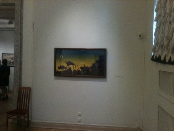 В центре внимания нынешней выставки – «Богатырский фриз», созданный Рерихом в 1910 году для столовой в доме купца и промышленника Филадельфа Бажанова в Петербурге. Фриз на героическую тему состоит из семи больших панно («Вольга», «Микула», «Илья Муромец», «Соловей-разбойник», «Садко», «Баян» и «Витязь»), общая длина которых достигает 25,75 метра. Помимо них у фриза еще 12 полотен поменьше. Четыре части этой работы висят в постоянной экспозиции музея, но целиком панно выставляется впервые. Почему не экспонируется целиком? Ответ прозаический. Проблема в размерах. Центральное полотно – «Садко» (2x7 м) – трудно разместить в зале. Так что увидеть весь фриз целиком – большая удача и редкость. Кроме того, впервые после реставрации выставляется фрагмент фриза «Городище».
