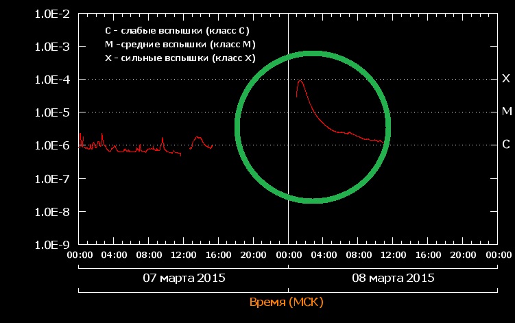 Самая сильная солнечная вспышка текущего 2015-го года была зарегистрирована на Солнце сегодня, 3 марта, через несколько часов после полуночи. Поток рентгеновского излучения на орбите Земли (один из основных показателей вспышки на Солнце) начал расти в 4:20–4:25 мск, достиг максимума около 04:35, после чего уменьшался в течение примерно 2 часов, вернувшись к нормальному уровню около 6 часов утра. Такой профиль – быстрый рост и относительно медленный спад – типичен для вспышек, которые обычно имеют очень резкую стадию нагрева, называемую импульсной, длящуюся всего минуты, а порой секунды, и долгую фазу спада. Продолжительность фазы спада просто равна времени, которое требуется разогретым до десятков миллионов градусов областям вспышки чтобы остыть и вернуться к нормальной температуре.