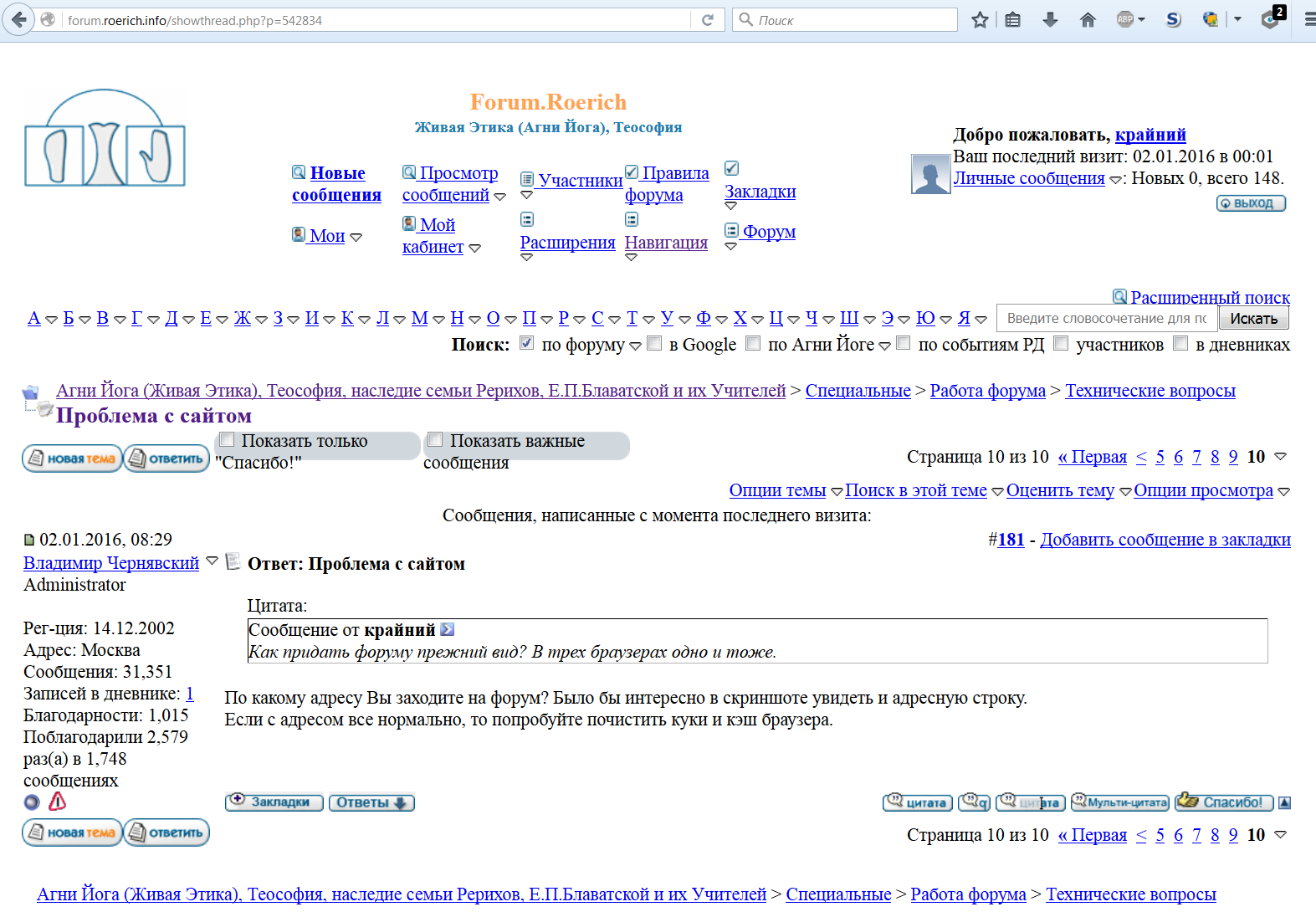 Живая Этика (Агни Йога), Теософия | | | Результаты поиска в Google | | | Результаты поиска по Агни Йоге | | | 02.01.2016, 09:29 | #181 | | Administrator Рег-ция: 14.12.2002 Адрес: Москва Сообщения: 44,905 Благодарности: 1,988 Поблагодарили 7,073 раз(а) в 4,822 сообщениях | Ответ: Проблема с сайтом Цитата: Сообщение от крайний Как придать форуму прежний вид? В трех браузерах одно и тоже. | По какому адресу Вы заходите на форум? Было бы интересно в скриншоте увидеть и адресную строку. Если с адресом все нормально, то попробуйте почистить куки и кэш браузера. | | | 02.01.2016, 14:00 | #182 | Рег-ция: 10.01.2010 Сообщения: 4,384 Благодарности: 1,558 Поблагодарили 796 раз(а) в 521 сообщениях | Ответ: Проблема с сайтом Так на каждой странице. Чистка браузера не помогает. Определил, что такое происходит при использовании сервиса впн. Но раньше и с ним все работало. Да и на других сайтах проблем с оформлением нет. | | | 02.01.2016, 15:07 | #183 | Рег-ция: 10.12.2003 Адрес: Алтай Сообщения: 3,964 Благодарности: 28 Поблагодарили 1,506 раз(а) в 870 сообщениях | Ответ: Проблема с сайтом Судя по картинке, у крайнего не обрабатывается таблица стилей (*.css). | | | 02.01.2016, 15:28 | #184 | Рег-ция: 10.01.2010 Сообщения: 4,384 Благодарности: 1,558 Поблагодарили 796 раз(а) в 521 сообщениях | Ответ: Проблема с сайтом Наверное у этого сервиса впн на бесплатном подключении установили какие-нибудь дополнительные ограничения. Поставил другой клиент и все заработало. | | | 16.06.2016, 12:06 | #185 | Рег-ция: 10.01.2010 Сообщения: 4,384 Благодарности: 1,558 Поблагодарили 796 раз(а) в 521 сообщениях | Ответ: Проблема с сайтом В теме Киноторба, при цитировании сообщения целиком, получается такая картина http://forum.roerich.info/images/pro...temp45c643.PNG При цитировании только выделенного текста такого не происходит Скорее всего это из-за фото медведя. В других темах все нормально. Последний раз редактировалось крайний, 16.06.2016 в 12:09. | | | 16.06.2016, 12:24 | #186 | | Administrator Рег-ция: 14.12.2002 Адрес: Москва Сообщения: 44,905 Благодарности: 1,988 Поблагодарили 7,073 раз(а) в 4,822 сообщениях | Ответ: Проблема с сайтом Цитата: Сообщение от крайний Скорее всего это из-за фото медведя. В других темах все нормально. | Именно так. Коллеги вставили слишком большое фото. | | | 19.01.2019, 21:30 | #187 | Рег-ция: 25.01.2005 Адрес: Jelgava, LV Сообщения: 2,123 Благодарности: 1 Поблагодарили 72 раз(а) в 53 сообщениях | Ответ: Проблема с сайтом В "облаке тэгов" на первой странице форума написано: "дугпа - Елена Рерих", это надо чтоб так было? __________________ Сказка о Золотом Веке | | | 21.01.2019, 13:59 | #188 | | Administrator Рег-ция: 14.12.2002 Адрес: Москва Сообщения: 44,905 Благодарности: 1,988 Поблагодарили 7,073 раз(а) в 4,822 сообщениях | Ответ: Проблема с сайтом Цитата: Сообщение от Аволикешвару В "облаке тэгов" на первой странице форума написано: "дугпа - Елена Рерих", это надо чтоб так было? | Знаком "-" разделяются названия тегов различных тем. Не нужно облако тегов читать как связанный текст. | | | 16.08.2019, 06:21 | #189 | Рег-ция: 26.01.2005 Сообщения: 968 Благодарности: 720 Поблагодарили 104 раз(а) в 54 сообщениях | Ответ: Проблема с сайтом А что с статистикой форума ? Так надо ? | | | 16.08.2019, 18:56 | #190 | | Banned Рег-ция: 02.03.2019 Сообщения: 169 Благодарности: 2 Поблагодарили 17 раз(а) в 14 сообщениях | Ответ: Проблема с сайтом Цитата: Сообщение от Galina А что с статистикой форума ? Так надо ? | Поддерживаю вопрос – откуда такая статистика посещаемости форума? Если судить по активности адептов форума, то мы давно уже умерли! | | | 16.08.2019, 20:16 | #191 | | Administrator Рег-ция: 14.12.2002 Адрес: Москва Сообщения: 44,905 Благодарности: 1,988 Поблагод