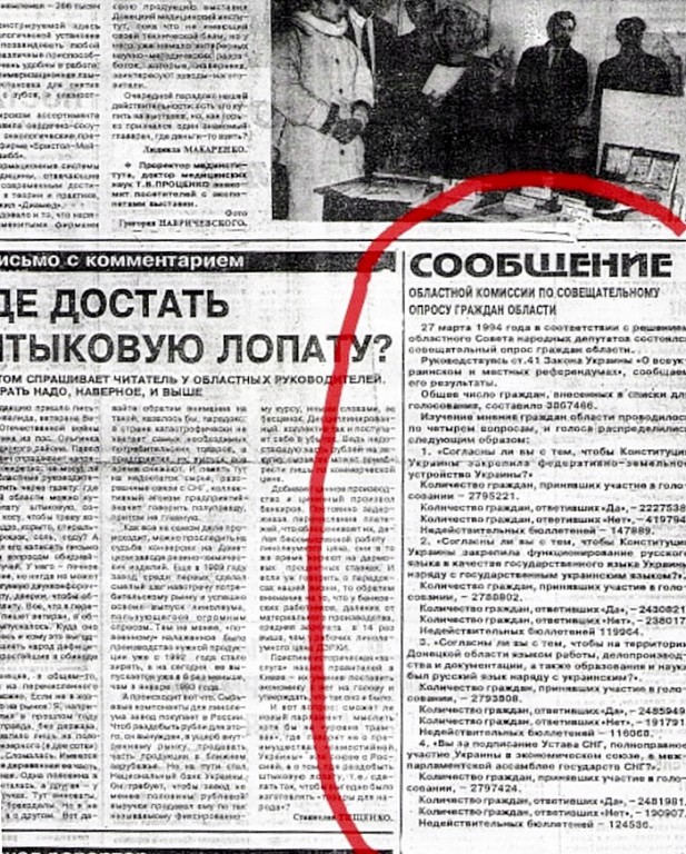 27 марта 1994 года состоялись выборы в Верховную раду Украины. Но в Донецкой и Луганской областях параллельно с ними прошел референдум, в ходе которого предстояло определить отношение Донбасса к статусу русского языка, государственному устройству Украины и евразийской интеграции. Ведь голосование 1 декабря 1991 г. о независимости Украины стало форменным обманом народа, т.к. был поставлен вопрос: "Подтверждаете ли Вы Акт провозглашения независимости Украины?" В самой формулировке уже был заложен ответ "да" - ведь спрашивалось не о том, вы ЗА независимость или ПРОТИВ, а о том, был ли акт или нет. Конечно, он был. Народ просто был обманут. Я не утверждаю, что в случае другой формулировки народ проголосовал бы против, но иметь в виду этот факт обязательно нужно.