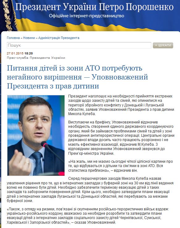 "Президент настаивает на необходимости принятия экстренных мер по защите детей и семей, которые оказались на территории вооруженного конфликта в Донецкой и Луганской областях, заявил Уполномоченный Президента по правам ребенка Николай Кулеба.