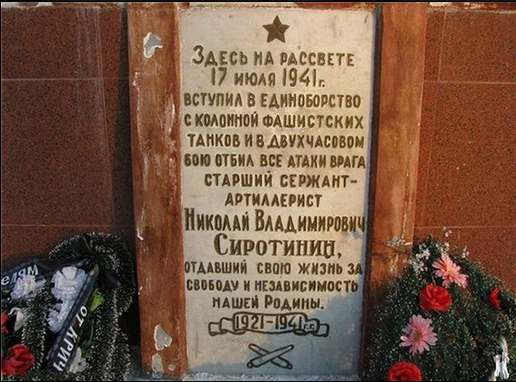 Надо ли такое преклонение?" Обер-лейтенант Хёнфельд так и не понял, в какую войну и с кем ввязалась Германия. Обер- лейтенант Хёнфельд убит под Тулой летом 1942 года. Советские солдаты обнаружили его дневник и передали военному журналисту Фёдору Селиванову. Имя - Николай. Отчество - Владимирович. Фамилия - Сиротинин. Рост - Сто шестьдесят четыре сантиметра. Вес - пятьдесят четыре килограмма. Звание - старший сержант. Русский. Воинская профессия - артиллерист, командир орудия. Возраст - двадцать лет. Деревенский. 55-й стрелковый полк, 6-я стрелковая дивизия. И, пятьсот фашистов, двести пулеметов, пятьдесят девять пушек. Тысяча двести тонн немецкого железа. Старший сержант Сиротинин Николай Владимирович, командир орудия противотанковой батареи похоронен со всеми воинскими почестями солдатами и офицерами четвёртой танковой дивизии вермахта на берегу реки Добрысть, у села Сокольничи. Неизвестный подвиг тясяча девятьсот сорок первого года. За который он награждён Орденом Отечественной Войны Первой Степени, посмертно, через девятнадцать лет, в 1960 году.