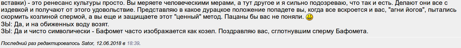 Живая Этика (Агни Йога), Теософия | | | Результаты поиска в Google | | | Результаты поиска по Агни Йоге | | | 13.06.2018, 16:37 | #241 | Рег-ция: 10.12.2003 Адрес: Алтай Сообщения: 3,964 Благодарности: 28 Поблагодарили 1,506 раз(а) в 870 сообщениях | Ответ: Новые записи ЕИР Цитата: Сообщение от Владимир Чернявский Цитата: Сообщение от Лена К. Цитата: Сообщение от Владимир Чернявский Цитата: Сообщение от Лена К. Тем не менее вопрос о наличии темы на форуме, где обсуждаются машинописи, остается. Если есть тема по поводу содержания машинописей, значит, неизбежно появляются и цитаты из них — как в аргументах, так и в контраргументах. | Вы предлагаете закрыть подобные обсуждения? | Предлагаю закрыть обсуждение новых записей в контексте предполагаемой их поддельности. | Т.е. баннить всех, кто считает их поддельными? | Это лучше того, что происходит сейчас. | | | 13.06.2018, 17:09 | #242 | Рег-ция: 16.12.2003 Адрес: Новосибирск Сообщения: 12,356 Благодарности: 3,008 Поблагодарили 3,286 раз(а) в 1,983 сообщениях | Ответ: Новые записи ЕИР Цитата: Сообщение от Лена К. Цитата: Сообщение от Владимир Чернявский Т.е. баннить всех, кто считает их поддельными? | Это лучше того, что происходит сейчас. | Если уже предлагается банить считающих тексты поддельными, то я считаю это еще одним доводом в сторону их сомнительности. Сначала надо провести экспертизу источников, как и хотели в НРК, также нужно провести перекрестное сравнение всех имеющихся текстов в России и в США. А до того, не нужно постить в данный форум взрывоопасную информацию, включая личные медицинские подробности. Это крайнее неуважение к Н.К. Рериху и Учителям. Пора прекратить эту вакханалию. | | | | Эти 3 пользователя(ей) сказали Спасибо Michael за это сообщение. | | 13.06.2018, 17:33 | #243 | Рег-ция: 15.03.2016 Сообщения: 11,817 Благодарности: 4,140 Поблагодарили 3,630 раз(а) в 2,498 сообщениях | Ответ: Новые записи ЕИР Вопрос в том как эти Записи вообще в Россию попали, если они не должны были сюда попасть. А в Индии ведь ещё тетради оставались? Это были дубликаты этих или другие? Они исчезли? | | | 13.06.2018, 17:49 | #244 | Рег-ция: 16.12.2003 Адрес: Новосибирск Сообщения: 12,356 Благодарности: 3,008 Поблагодарили 3,286 раз(а) в 1,983 сообщениях | Ответ: Новые записи ЕИР Цитата: Сообщение от Ларис Сомнительность записей? Завтра наступит черед линии Абрамовых, Спириной и Сибро. Думайте что говорите. Роете яму поддакивая негодяю. | Без проведения нормальной сверки источников да сомнительно  постить в форум noname машинописные бумажки. Известно же, что Хорши подделывали Письма Е.И.Рерих Рузвельту, + была мутная история с нападками на К.Кэмпбелл, которая не раз всех спасала + проявлено явное неуважение к Н.К.Рериху, которое в силу грубости или еще чего-то или не осознаётся или происходит совершенно сознательно и чем дальше тем сильнее ,что ложится на всех форумчан. Достаточно посмотреть с этической стороны на происходящее, чтобы увидеть если не всё, то очень многое. Последний раз редактировалось Michael, 13.06.2018 в 17:51. | | | 13.06.2018, 17:49 | #245 | Рег-ция: 09.05.2004 Сообщения: 824 Благодарности: 410 Поблагодарили 348 раз(а) в 181 сообщениях | Ответ: Новые записи ЕИР Цитата: Сообщение от Владимир Чернявский Владимир, по-моему так трактовать ошибку - наводить тень на плетень... Отнюдь. Это очень серьезный вопрос корректности работы с источниками. | Владимир - никто не покушается на необходимость корректной работы с источниками. Для нас высокий Источник ВСЕ материалы Архи