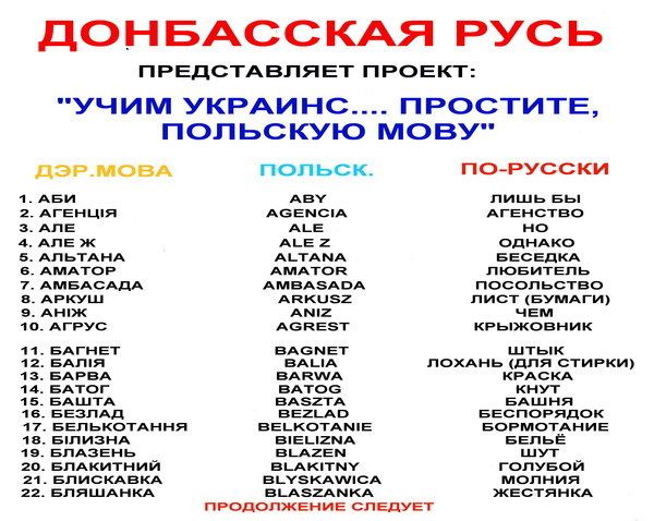 Ну, так что, вы согласны, что украинский и русский всего лишь диалекты единого языка? Искусственно разводимые Я вчера смотрел на ютюбе украинскую программу тв. Бегущая строка. Я понимаю о чем речь, некоторые слова в русском языке отсутствуют, а некоторые имеют другое значение, например, богато. Но в целом то я все понял. Речь шла о том, что эстонские власти будут защищать украинских заробитчан в случае нарушения их прав работодателем. Я бы не понял этого ни на польском, ни на немецком, ни на итальянском. А на украинском понял.