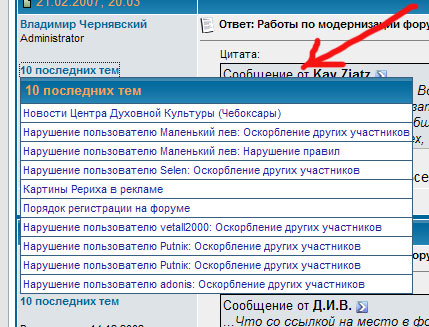 Живая Этика (Агни Йога), Теософия | | | Результаты поиска в Google | | | Результаты поиска по Агни Йоге | | | 21.04.2007, 20:13 | #1 | | Administrator Рег-ция: 14.12.2002 Адрес: Москва Сообщения: 44,904 Благодарности: 1,988 Поблагодарили 7,069 раз(а) в 4,821 сообщениях | 10 последних тем пользователя В постах в разделе информации об участнике добавлено всплывающее меню с 10-ю последними темами, в которых участник является автором.  | | | 22.04.2007, 00:40 | #2 | | Banned Рег-ция: 26.05.2006 Сообщения: 4,070 Благодарности: 334 Поблагодарили 138 раз(а) в 116 сообщениях | Ответ: 10 последних тем пользователя зачем оно нужно?? для тотального контроля друг за другом? раньше можно было в профиле смотреть ...и было достаточно ... | | | 22.04.2007, 08:32 | #3 | | Administrator Рег-ция: 14.12.2002 Адрес: Москва Сообщения: 44,904 Благодарности: 1,988 Поблагодарили 7,069 раз(а) в 4,821 сообщениях | Ответ: 10 последних тем пользователя Цитата: Сообщение от vetall2000 зачем оно нужно?? для тотального контроля друг за другом?... |  Веталл, если применить "принцип доброго глаза", то наверняка можно использовать эту новую возможность форума с доброй пользой. | | | 22.04.2007, 09:12 | #4 | Рег-ция: 15.07.2005 Сообщения: 8,847 Благодарности: 790 Поблагодарили 1,823 раз(а) в 1,176 сообщениях | Ответ: 10 последних тем пользователя Цитата: Сообщение от Владимир Чернявский ...если применить "принцип доброго глаза".. | Ну это только если ... А на самом деле, разве его (этот принцип) тут на форуме все активно применяют? Если да, то этот "принцип доброго глаза" в больших солнцезащитных очках.  | | | 22.04.2007, 09:32 | #5 | | Administrator Рег-ция: 14.12.2002 Адрес: Москва Сообщения: 44,904 Благодарности: 1,988 Поблагодарили 7,069 раз(а) в 4,821 сообщениях | Ответ: 10 последних тем пользователя Цитата: Сообщение от Борис Солнцев Цитата: Сообщение от Владимир Чернявский ...если применить "принцип доброго глаза".. | Ну это только если ... | Это "если" зависит от доброй воли каждого. | | | 22.04.2007, 10:42 | #6 | | Banned Рег-ция: 17.11.2005 Адрес: Украина Сообщения: 14,036 Благодарности: 1,636 Поблагодарили 1,451 раз(а) в 1,141 сообщениях | Ответ: 10 последних тем пользователя А мне нравицца. Иногда забываешь, в какой именно теме отвечал оппоненту, и начинаешь лазить по всем, где он мог бы быть...  Долго и непродуктивно. Так шо - все правильно.  | | | 22.04.2007, 11:09 | #7 | | Banned Рег-ция: 26.05.2006 Сообщения: 4,070 Благодарности: 334 Поблагодарили 138 раз(а) в 116 сообщениях | Ответ: 10 последних тем пользователя Так в профиле все можно как и раньше найти ... а вот когда была оценка сообщений - можно было автору сообщения высказать пожелание. было удобно и практично. теперь этого нет. | | | 22.04.2007, 15:09 | #8 | Рег-ция: 12.01.2007 Сообщения: 6,981 Благодарности: 601 Поблагодарили 944 раз(а) в 715 сообщениях | Ответ: 10 последних тем пользователя С этой услугой, без этой услуги, все равно последние три месяца этот форум был пиар площадкой для Модого Льва. Так какая разница? и так сильно отклонились от самостоятельной работы, кого ни почитаешь-все в погоне за Львом.  ( __________________ Дары Пандоры - это чистый огонь Пространства 26 мая 2018 Пандора по просьбе Востока покинула этот форум. . | | | 22.04.2007, 15:24 | #9 | | Banned Рег-ция: 17.11.2005 Адрес: Украина Сообщения: 14,036 Благодарности: 1,636 Поблагодарили 1,451 раз(а) в 1,141 сообщениях | Ответ: 10 последних тем пользователя Цитата: Сообщение от Золушка С этой услугой, без этой услуги, все равно последние три месяца этот форум был пиар площадкой для Модого Льва. Так какая разница? и так сильно отклонились от самостоятельной работы, кого ни почитаешь-все в погоне