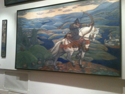 В центре внимания нынешней выставки – «Богатырский фриз», созданный Рерихом в 1910 году для столовой в доме купца и промышленника Филадельфа Бажанова в Петербурге. Фриз на героическую тему состоит из семи больших панно («Вольга», «Микула», «Илья Муромец», «Соловей-разбойник», «Садко», «Баян» и «Витязь»), общая длина которых достигает 25,75 метра. Помимо них у фриза еще 12 полотен поменьше. Четыре части этой работы висят в постоянной экспозиции музея, но целиком панно выставляется впервые. Почему не экспонируется целиком? Ответ прозаический. Проблема в размерах. Центральное полотно – «Садко» (2x7 м) – трудно разместить в зале. Так что увидеть весь фриз целиком – большая удача и редкость. Кроме того, впервые после реставрации выставляется фрагмент фриза «Городище».