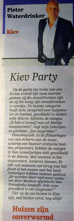 «Пир во время чумы. Нравится вам здесь, на Украине?» 29.10.2014 Ведущая голландская газета «De Telegraaf» опубликовала очерк их известного журналиста Питера Ватердринкера под заголовком «Киевская вечеринка». Он описывает гулянку на квартире какого-то киевского богатея с полуголыми девицами и эротическими танцами.