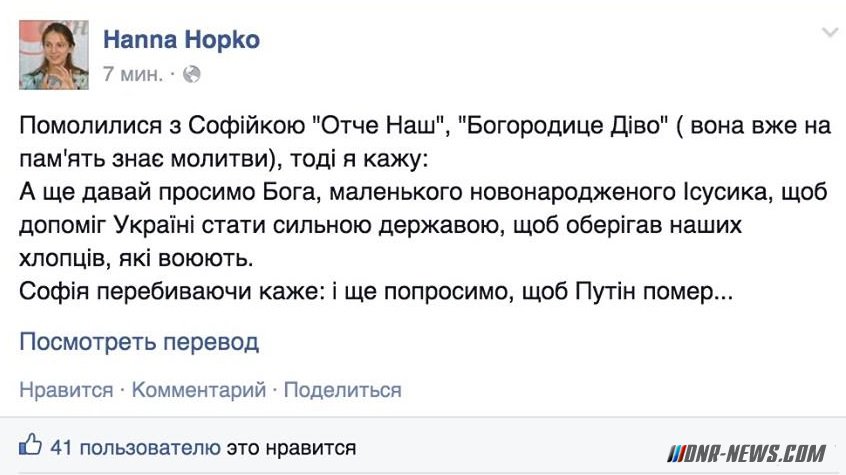 Дипломатическая этика? Ответственность политика? Не, не слышали. Глава парламентского комитета по иностранным делам Анна Гопко опубликовала вчера вечером пост, а через 15 минут малодушно его удалила. Позиционирующая себя политиком новой формации, очень набожная Аня умиляется доченьке Софийке, которая в рождественской молитве просит Господа о... смерти Путина. Я молчу уже о том, какими надо быть моральными уродами, чтобы так воспитать ребенка. Чтобы вообще возникла мысль просить Бога о чьей-то смерти. Но хвастаться этим на фейсбуке? Ты же, Аня, не домохозяйка из галицкого села и не полоумная блогерша вроде. Патрон твоего хозяина Байдена (я об Обаме, если что) тоже, например, не любит Путина. Но как-то держит себя в руках. Я думала, она умнее. Тем лучше, впрочем.