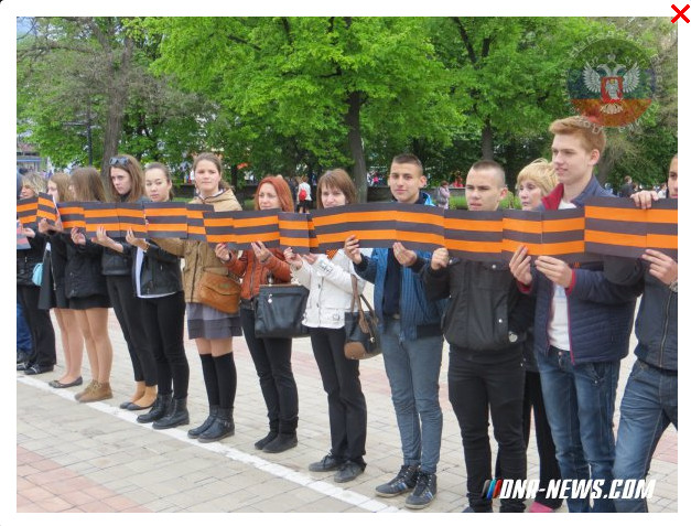 В Донецке прошла акция «Георгиевская ленточка» Сегодня, 6 мая, в Донецке около Спасо-Преображенского кафедрального собора, в честь праздника Святого Георгия Победоносца, прошла акция «Георгиевская ленточка». Более 2 тыс. донецких школьников из 90 школ Калининского, Ворошиловского, Киевского и других районов города образовали живую Георгиевскую ленту, длиной более 1,5 км. Как пояснил директор департамента образования Донецкой городской администрации Андрей Удовенко, инициатива проведения этой акции принадлежала ученикам УВК № 5 имени Николая Бойко. Целью акции стало проявление патриотизма донецкими школьниками."
