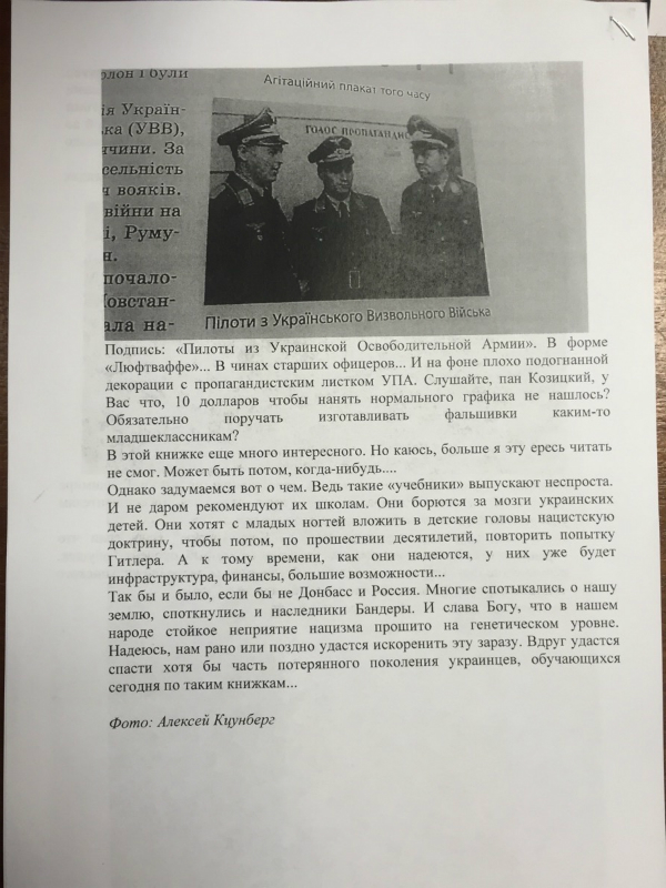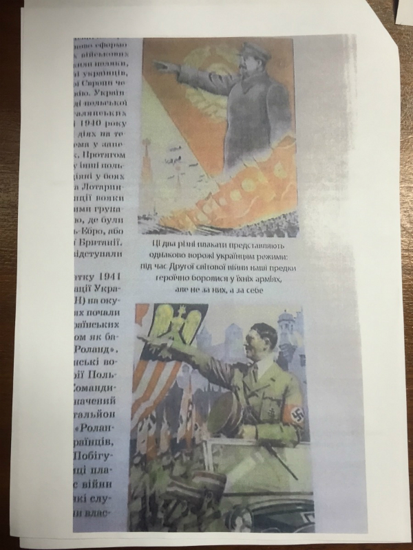 Но грубой карикатурой на российского лидера дело не ограничилось. В учебнике можно встретить и агитку с пилотами Украинской освободительной армии в форме люфтваффе, и уподобление Иосифа Сталина Адольфу Гитлеру. Автор учебного пособия разместил на одной странице плакаты с указывающим вперед Сталиным и с "зигующим" Гитлером. На основании этого Козицкий пишет следующее: