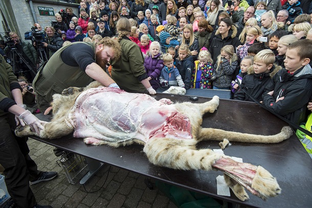 Во время расчленения животного работники зоопарка комментировали происходящее и демонстрировали части тела львицы окружающим. Кроме того, любой желающий мог посмотреть прямую трансляцию в сети.