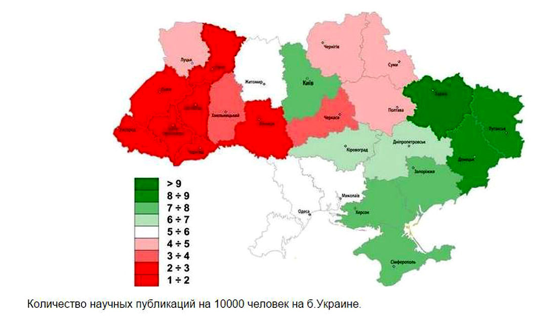 Когда говорят, что Юго-Восток это ватники, а Западная Украина это сплошь интеллектуальная элита, просто покажите им карту научных публикаций на Украине несколько лет назад.