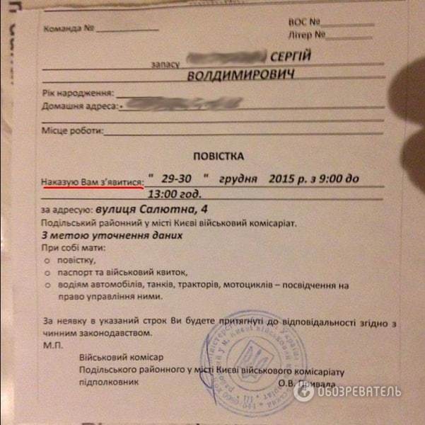 " В канун Нового года киевлянам начали приходить повестки с приказом явиться в районные военные комиссариаты. Это весьма неожиданно, учитывая, что осенний призыв на военную службу уже закончился, а седьмая волна мобилизации официально не объявлена.!? Киевлянин Сергей Л. продемонстрировал нашему изданию корешок с подписью начальника военного комиссариата Подольского района, где значилось, что если он не явится в указанный срок, то будет привлечен к ответственности. «С какой стати без объявления мобилизации военкоматы начали вручать повестки? К тому же, какой из меня военнослужащий, если я инвалид: у меня большие проблемы со слухом», — рассказал молодой человек. В Генеральном штабе Вооруженных сил Украины признали, что военкоматы действительно начали разносить повестки, однако это не имеет никакого отношения ни к призыву, ни к мобилизаци. 2