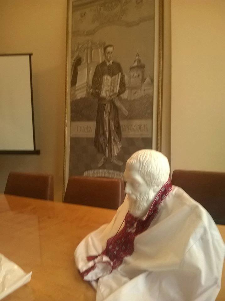 Маразм не имеет предела крепости - Аристотеля то за что? ОрестотIлко. Воспитатель Сашка Купидонского. «Патриотизм» дошел до ручки. В институте философии Национальной академии наук Украины во время конференция скульптуру Аристотеля нарядили в вышиванку. Об этом рассказал политолог, директор Киевского центра политических исследований и конфликтологии Михаил Погребинский. Соответствующий пост он опубликовал на своей странице в социальной сети Facebook. Неизвестные надели на древнегреческого философа вышиванку. «В институте философии НАН Украины конференция по Аристотелю. В президиуме Аристотель в вышиванке. Теперь за философию на Украине я спокоен», — иронизирует политолог.