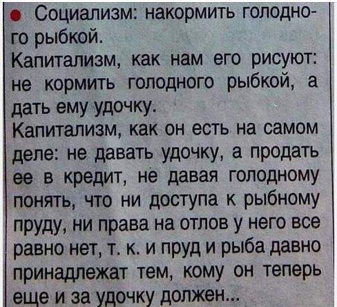 Живая Этика (Агни Йога), Теософия | | | Результаты поиска в Google | | | Результаты поиска по Агни Йоге | | | 24.02.2016, 20:55 | #1461 | Рег-ция: 15.08.2012 Адрес: Россия Сообщения: 6,262 Благодарности: 838 Поблагодарили 455 раз(а) в 397 сообщениях | Ответ: Коммунизм - свет. Капитализм - тьма? Цитата: Сообщение от Ллес Цитата: Сообщение от Алекс3 Говоря о почве и деревьях, я имел в виду – возобновляемые ресурсы. Которых человечеству хватит еще на миллионы лет, если только оно не уничтожит себя и Землю. А нефть и газ все равно кончатся, и человечество найдет другие источники энергии. | Человечество уже уничтожает себя и Землю. Может, даже сейчас уже поздно остановить процесс умирания планеты. По крайней мере надо немедленно заняться его остановкой. Хотя бы попробовать остановить. А вместо этого Вы предлагаете заниматься чем-то другим. | Цитата: Цитата: 317. Не только людская безработица образуется в пределах опасности, но также и безработица природы должна наконец обратить внимание. Нужно только представить себе, как быстро цветущая растительность сменяется мёртвыми песками. Не бесхозяйственностью, но самоубийством нужно назвать это омертвление коры земной. Пески, льды, оползни не являют блестящее будущее. Ведь невозможно ускорить излечение природы, даже если бы люди обратились к здоровому мышлению; потребуются десятки лет, чтобы оздоровить разрушение коры планеты. Но для таких особо благих мер необходимо человеческое сотрудничество. Но разве видны признаки такой совместной работы? Разве разрушение и разъединение не владеют умами? Разве каждая попытка объединения не встречается насмешкою? ... | Вот приведенная вами в другой теме цитата. Предлагаю внимательно в нее вчитаться. И понять что путь к спасению планеты лежит через исцеление человечества и оздоровлению его мышления. А оздоровление мышление ведет к принятию коммунистических норм общежития. Другого пути к спасению у человечества нет. | | | | Эти 3 пользователя(ей) сказали Спасибо Алекс3 за это сообщение. | | 28.02.2016, 20:00 | #1462 | Рег-ция: 22.02.2007 Сообщения: 20,422 Благодарности: 61 Поблагодарили 5,181 раз(а) в 3,587 сообщениях | Ответ: Коммунизм - свет. Капитализм - тьма? Цитата: | специалисты Голдман Сакс пишут: "...возникает множество вопросов по поводу эффективности капитализма" | http://www.bloomberg.com/news/articl...ism-is-working … __________________ "Чем ближе к Солнцу,тем ближе к Истине" Александр Чижевский | | | | Этот пользователь сказал Спасибо gog за это сообщение. | | 05.03.2016, 00:32 | #1463 | Рег-ция: 29.01.2007 Адрес: Русь Сообщения: 151 Благодарности: 0 Поблагодарили 9 раз(а) в 7 сообщениях | О капитализме без экономизма Понятие властитутка возникло сравнительно недавно и многие еще спрашивают, а что же это такое? Властитутки это те, которые заявляют: «Мы тут власть!» Властитутки работают, вроде как, на народ, но без любви, и народ относится к ним так же. Основной интерес властитутки это денежное вознаграждение, получаемое легальным или криминальным образом. В настоящее время в различных странах и культурах отношение к влаституции неодинаково — в одних она считается нормальным явлением и законным видом коммерческой деятельности, в других — правонарушением, в третьих — преступлением. Однако отношение к такому виду влаституции как коррупция почти повсеместно — резко отрицательно во всех смыслах. Такое же негативное отношение и к другому виду влаституции – лоббированию законов. Т