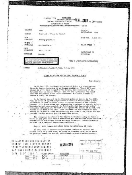 Неудачники не нужны Америке...потому что бандеровскую раковую опухоль, опутавшую своими метастазами целую страну, явно готовят "облучению". В электронной библиотеке Центрального разведывательного управления США был обнаружен прелюбопытнейший документ на четырех страницах, датированный 1951 годом. В документе утверждается что икона украинского национализма (интегрального национализма, русофобии, антисоветчины и антикоммунизма) Степан Бандера ( Stepan Bandera ) был германским шпионом. Документы в электронной библиотеке ЦРУ появились еще 10 лет назад, но доступны они стали для широкой публики недавно. Радует что осознание исторической правды происходит и в США, что свидетельствует об угасании интереса Вашингтонского обкома к Украине Майдана. Если указанного документа будет мало, то можно покопаться в архиве ЦРУ еще глубже. Вас ждут настоящие открытия, в виде 293 страниц различных документов посвященных теме нацизма и лично Бандеры. Вы узнаете что он сотрудничал не только с Третьим Рейхом, но и с самим ЦРУ США, доставшись им по наследству. Американцы так прямо и написали: «Степан Бандера, украинский фашист и профессиональный шпион (немецкая кличка «Консул-2″)». Ну а кому и этого будет мало, могут смело обратиться в журнал «Шпигель», который еще в далеком 1959 году на смерть Бандеры рассказал, зачем его освободили из польской тюрьмы.