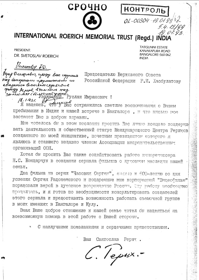 В дополнение, хочу обратить Ваше внимание на письмо С.Н.Рериха, которое касается дара Рерихов Третьяковской галерее: