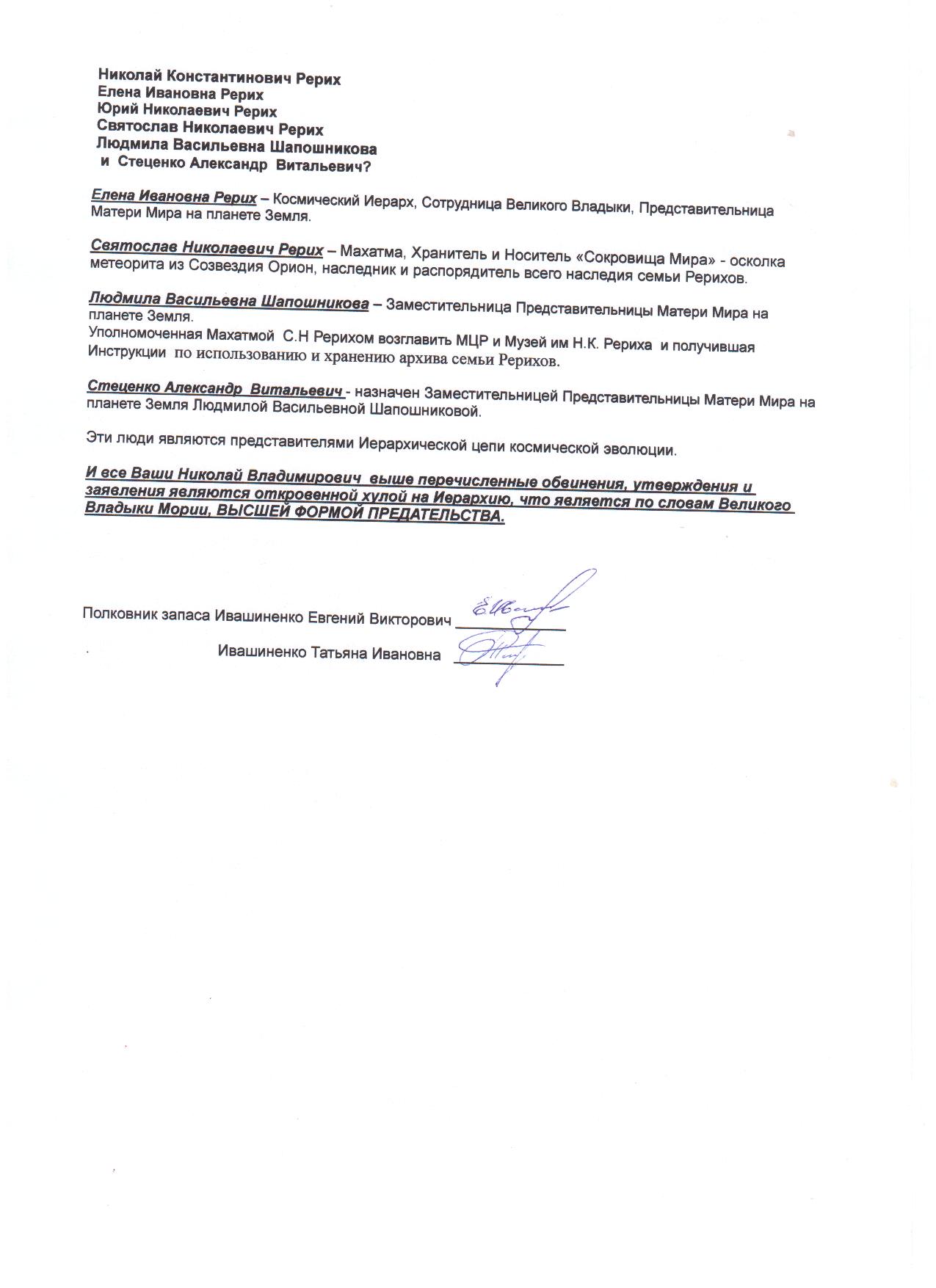 Живая Этика (Агни Йога), Теософия | | | Результаты поиска в Google | | | Результаты поиска по Агни Йоге | | | 26.05.2017, 19:09 | #7381 | Рег-ция: 19.04.2017 Сообщения: 338 Благодарности: 49 Поблагодарили 44 раз(а) в 34 сообщениях | Ответ: Ситуация в МЦР Цитата: Сообщение от seee Цитата: Сообщение от Владимир Чернявский Цитата: Сообщение от Iris Так вот откуда взялась информация, что при помощи Знамени Мира рериховцы подают сигналы пришельцам из Космоса (смотреть с 51 сек.) | Вывод, который сделает любой человек с улицы, почитав высказывания отдельных писателей про "последний отбор", "отправку темных на Сатурн, себя на Венеру или Юпитер", т.е. про то, чем любят публично спекулировать известные представители рериховского движения. | Так такие спекулирования "известных представителей рериховского движения" как раз можно прочитать на вашем форуме. На официальном сайте МЦР такого нет. Значит, Избачков пользуется сплетнями вашей площадки и тиражирует эту сплетню как заявление на прессу, почему-то указывая пальцем на МЦР, но не ваш форум? Как так? | Официальный сайт МЦР имеет пропагандистское назначение. Там вообще ничего не подчерпнуть, даже если захочется. В МЦР боятся живого общения и противоположных мнений. Поэтому его идейно выверенная политика скучна до тошнотворности как телепрограмма времен СССР с его однопартийным мнением на все. лучше уж про пришельцев слушать чем "лебединое озеро" по десятому кругу | | | 26.05.2017, 19:38 | #7382 | | Banned Рег-ция: 21.11.2003 Адрес: Елгава. Сообщения: 16,829 Благодарности: 107 Поблагодарили 6,161 раз(а) в 3,621 сообщениях | Ответ: Ситуация в МЦР Цитата: Сообщение от ninniku А я не помню, чтобы нотариус был фэйком. И кто прав? Печать стоит. За фальшивку садят во всех странах. | Во всех случаях указывается адрес нотариальной конторы или нотариуса, у которого должен хранится второй экземпляр. А адресов у этой писульки нет. Это уже нарушение которое ставит всё под сомнение. Кого садить, если такого ни нотариуса, ни контору найти невозможно? И кто будет искать? | | | | Этот пользователь сказал Спасибо adonis за это сообщение. | | 26.05.2017, 19:41 | #7383 | Рег-ция: 21.12.2006 Сообщения: 4,872 Благодарности: 3,048 Поблагодарили 1,418 раз(а) в 706 сообщениях | Ответ: Ситуация в МЦР Цитата: Сообщение от Владимир Чернявский Цитата: Сообщение от seee Цитата: Сообщение от Владимир Чернявский Цитата: Сообщение от Iris Так вот откуда взялась информация, что при помощи Знамени Мира рериховцы подают сигналы пришельцам из Космоса (смотреть с 51 сек.) | Вывод, который сделает любой человек с улицы, почитав высказывания отдельных писателей про "последний отбор", "отправку темных на Сатурн, себя на Венеру или Юпитер", т.е. про то, чем любят публично спекулировать известные представители рериховского движения. | Так такие спекулирования "известных представителей рериховского движения" как раз можно прочитать на вашем форуме. На официальном сайте МЦР такого нет. Значит, Избачков пользуется сплетнями вашей площадки и тиражирует эту сплетню как заявление на прессу, почему-то указывая пальцем на МЦР, но не ваш форум? Как так? | Не думаю, что Избачков читает этот форум. Скорее всего речь идет о письмах, которые приходят от защитников МЦР в адрес Минкульта. | Минкульт пересылает письма Избачкову? | | | | Этот пользователь сказал Спасибо seee за это сообщение. | | 26.05.2017, 19:43 | #7384 | Рег-ция: 21.12.2006 Сообщения: 4,872 Благодарности: 3,048 Поблагодарили 1,418 раз(а) в 706 со