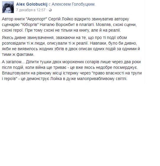 Журналист и писатель, автор книги «Аэропорт» Сергей Лойко обвинил авторов фильма «Киборги» в плагиате. Об этом он написал на своей странице в Фейсбуке