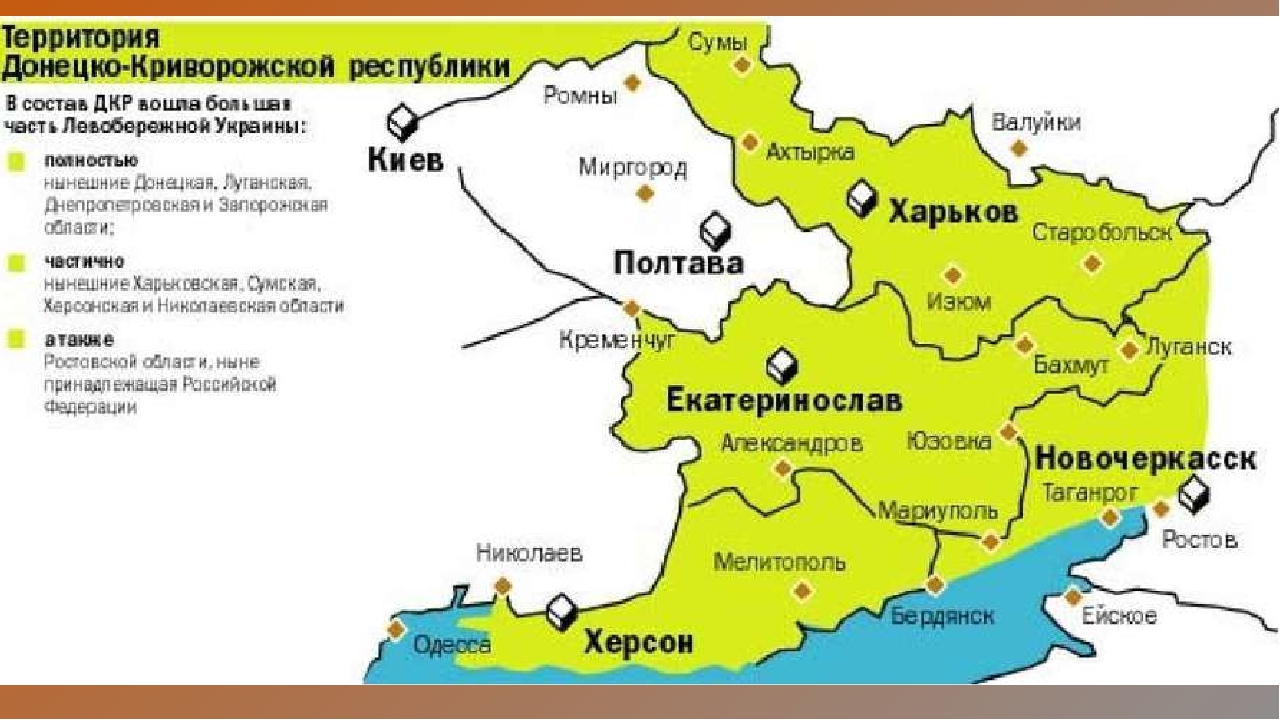 Идея автономии Донбасса далеко не нова. Она отметила восьмой десяток лет своего существования и вполне доказала свою жизнестойкость. И хотя из современных учебников истории складывается впечатление, что кроме УНР и ЗУНР, никаких иных республик на Украине не было, но в действительности все было иначе. Более 70 различных «республик» и «правительств» возникло на территории российской империи, в том числе на Украине. Среди них — Киевское национальное правительство Центральной Рады, Харьковское советское правительство, Крымско-татарское правительство в Бахчисарае, Одесская Советская Республика, ССР Тавриды в Симферополе. Самым крупным из этих государственных образований была Донецко-Криворожская Советская Республика со столицей в Харькове.
