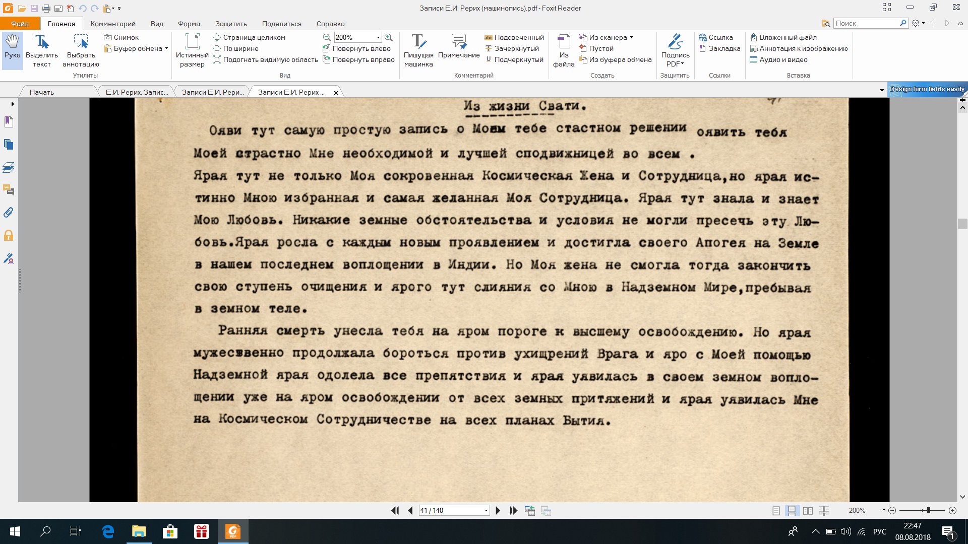 " Теперь Наше поручение Ур[усвати]. Каждый вступающий в Нашу Общину должен предварительно написать свою жизнь с точки [зрения] явлений Наших и запросов духа. Обычно это пишется без имени в третьем лице. Например — родилась девочка, появление которой считалось нежелательным. Конечно, некоторые силы принимали усилия, чтоб воспрепятствовать ее рождению, и так далее. Факты внешние и внутренние, сознание. Такие углубления необходимы. Надо как бы со стороны посмотреть, и когда сны связываются с сознанием явно, тогда получается община бытия вне так называемой жизни. Не торопясь, и на перевалах, и в пустыне можно вспомнить черты большого удельного веса. Самое яркое сознание — это существование Учителя. Можно так же, как и сознание, рассеченное телом, о посещении двух великанов. Советую не писать подряд. Лучше заносить отдельные эпизоды и ставить около них номер[а], которые и останутся на полях, показывая последовательность воспоминаний. Советую не напрягаться и не желать утомляться."