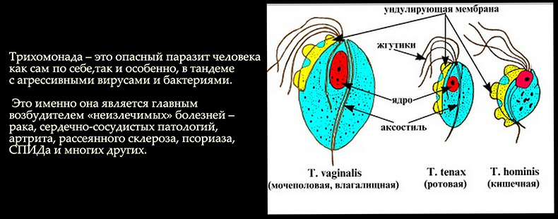 С возрастом человека из-за повторного многократного заражения (ротовой, кишечной и вагинальной) трихомонадами, ослабления иммунитета агрессивность трихомонад возрастает. Они образуют колонии - опухоли и метастазы. Таким образом, рак - это заключительный этап трихомоноза. Разделение опухолей по характеру роста на доброкачественную и злокачественнуюопределяется "силой" трихомонад и способом их размножения.
