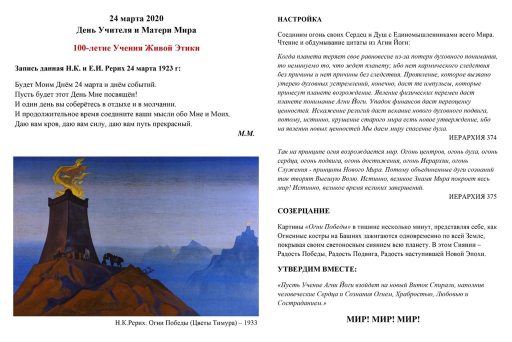 Приближается День Учителя, и столетие со дня "начала" Агни-Йоги. Поэт нашей группы в Беларуси написал стихотворение в преддверии этого дня на фоне всех происходящих событий в мире. В приложении посылаю вам стихотворение, пусть оно даст вам силы и крепости духа. Если посчитаете нужным, перешлите его вашим друзьям, коллегам, или может быть вы посчитаете интересным опубликовать его где-то на ваших ресурсах. Мы будем просто рады.