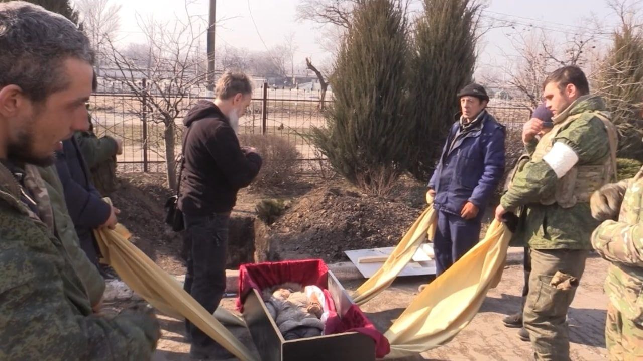Четверо мужчин несут на шторах маленький гроб, сделанный из дверей офисных шкафов... Это вчерашний Мариуполь. Убитых хоронят сразу. Иногда - во дворах домов. Хоронят не в гробах. В чем могут...