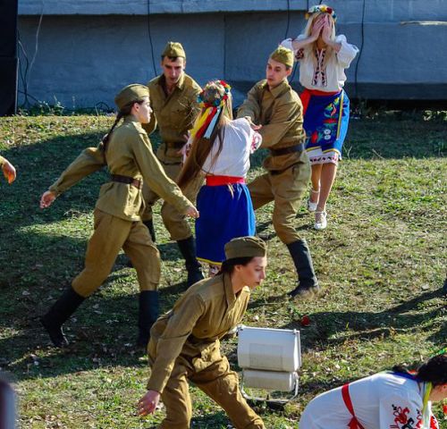 Запорожье - перед гостями-ветеранами под песню «Плывэ кача» предстал танец, основной частью которого была инсценировка избиения и изнасилования советскими солдатами девчушек-украинок, встречающих освободителей с цветами,
