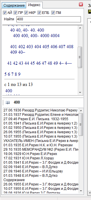 Живая Этика (Агни Йога), Теософия | | | Результаты поиска в Google | | | Результаты поиска по Агни Йоге | | | 29.09.2015, 13:35 | #1 | Рег-ция: 28.09.2015 Сообщения: 8 Благодарности: 0 Поблагодарили 0 раз(а) в 0 сообщениях | Индекс Уважаемые разработчики справочной системы! Индекс это существенная часть справочной системы: просматривая Индекс, находишь такие Темы (Слова), какие не догадаешься задать в поиске, чтобы просмотреть соответствующие ссылки, где в Источниках эти Темы упоминаются. Если возможно, верните возможность работы с Индексом, как это было в версиях 1.34...1.70. К сожалению, в версии 1.85 с Индексом работать стало невозможно. | | | 01.10.2015, 06:30 | #2 | | Administrator Рег-ция: 14.12.2002 Адрес: Москва Сообщения: 44,905 Благодарности: 1,988 Поблагодарили 7,073 раз(а) в 4,822 сообщениях | Ответ: Индекс Цитата: Сообщение от nnn К сожалению, в версии 1.85 с Индексом работать стало невозможно. | Подскажите, что конкретно не позволяет работать с индексом? | | | 12.10.2015, 23:38 | #3 | Рег-ция: 28.09.2015 Сообщения: 8 Благодарности: 0 Поблагодарили 0 раз(а) в 0 сообщениях | Ответ: Индекс Если коротко и без подробных примеров, то отвечу так: в окне под окошком Индекса у меня при работе с версией 1.85 не появляются ссылки, где встречается данное Число или Слово (смотря что выбрать в Индексе). Попробуйте, для примера,выбрать в окошке Индекса Число 4000 и сравните, какая информация появится в окошке под окошком Индекса в версиях AYSearch 1.34 и 1.85 | | | 13.10.2015, 07:22 | #4 | | Administrator Рег-ция: 14.12.2002 Адрес: Москва Сообщения: 44,905 Благодарности: 1,988 Поблагодарили 7,073 раз(а) в 4,822 сообщениях | Ответ: Индекс Цитата: Сообщение от nnn Попробуйте, для примера,выбрать в окошке Индекса Число 4000 и сравните, какая информация появится в окошке под окошком Индекса в версиях AYSearch 1.34 и 1.85 | В 1.85 появляется ссылка на введение первого тома Тайной Доктрины (см. вложение). А в 1.34 что появляется? | | | 13.10.2015, 12:02 | #5 | Рег-ция: 28.09.2015 Сообщения: 8 Благодарности: 0 Поблагодарили 0 раз(а) в 0 сообщениях | Ответ: Индекс | | | 13.10.2015, 13:33 | #6 | Рег-ция: 06.04.2003 Сообщения: 5,042 Благодарности: 714 Поблагодарили 1,758 раз(а) в 1,095 сообщениях | Ответ: Индекс Цитата: Сообщение от nnn Если коротко и без подробных примеров, то отвечу так: в окне под окошком Индекса у меня при работе с версией 1.85 не появляются ссылки, где встречается данное Число или Слово (смотря что выбрать в Индексе). Попробуйте, для примера,выбрать в окошке Индекса Число 4000 и сравните, какая информация появится в окошке под окошком Индекса в версиях AYSearch 1.34 и 1.85 | У меня Индекс работает и выдает все перечисленные вами письма и статьи. Вам надо выбрать число 4000 в окошке под строчкой "найти". Там в самом низу есть варианты, в т.ч. и это число. Просто кликните на него и все получится. Версия 1.85 | | | | Этот пользователь сказал Спасибо Андрей С. за это сообщение. | | 14.10.2015, 07:52 | #7 | | Administrator Рег-ция: 14.12.2002 Адрес: Москва Сообщения: 44,905 Благодарности: 1,988 Поблагодарили 7,073 раз(а) в 4,822 сообщениях | Ответ: Индекс Цитата: Сообщение от nnn При задании в Индексе Числа 4000 в версии 1.34 появляются следующие ссылки: | Не внимательно посмотрел. Для числа 4000 в 1.85 выводится обширный список (см. вложение) | | | 23.10.2015, 20:43 | #8 | Рег-ция: 28.09.2015 Сообщения: 8 Благодарности: 0 Поблагодарили 0 раз(а) в 0 сообщениях | Ответ: Индекс Если я задал для поиска Число 4000, то не ожидаю от Индекса увидеть ссылки, в которых встречаются Числа 4, 40, 400, 40000 и.т.д, но именно те и только те, в которых встречается Число 4000: это тот резуль
