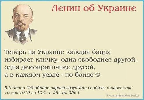 | Рег-ция: 23.02.2008 Адрес: Украина Сообщения: 9,586 Благодарности: 5,319 Поблагодарили 2,741 раз(а) в 1,606 сообщениях | Владимир Ильич Ленин, который в статье «Об обмане народа лозунгами свободы и равенства», опубликованной 19 мая 1919 года, писал: «Теперь на Украине каждая банда избирает кличку, одна свободнее другой, одна демократичнее другой, на каждом уезде по банде». | ||