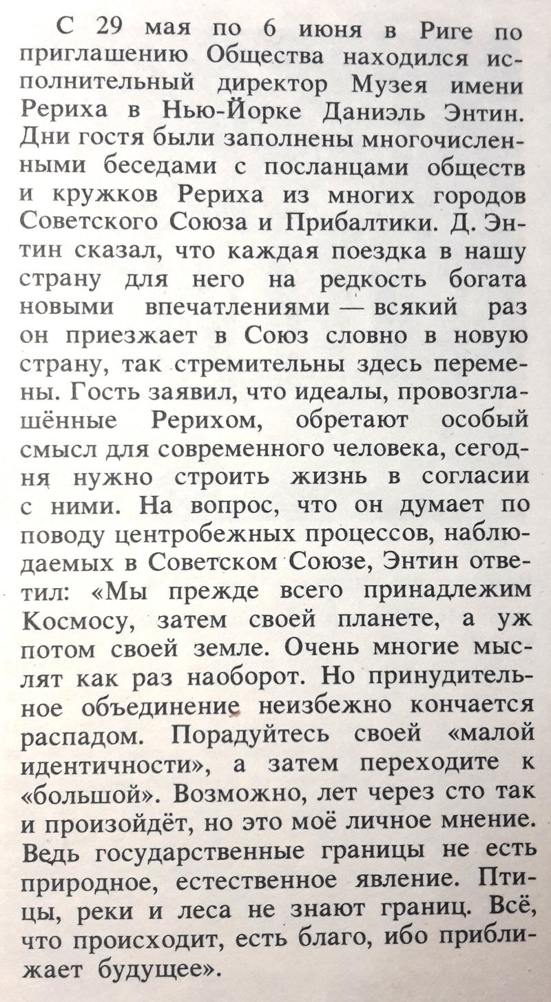 | Administrator Рег-ция: 14.12.2002 Адрес: Москва Сообщения: 44,904 Записей в дневнике: 1 Благодарности: 1,988 Поблагодарили 7,069 раз(а) в 4,821 сообщениях | Недавно, просматривая выпуски журнала Латвийского Общества Рериха начала 90-х годов, обратил внимание на сообщения о встречах с Даниилом Энтиным. Думаю, уместно привести их здесь. Так же публикую и давнишнее интервью с Даниилом. --------------------------------- Последний раз редактировалось Владимир Чернявский, 20.01.2017 в 21:42. | ||