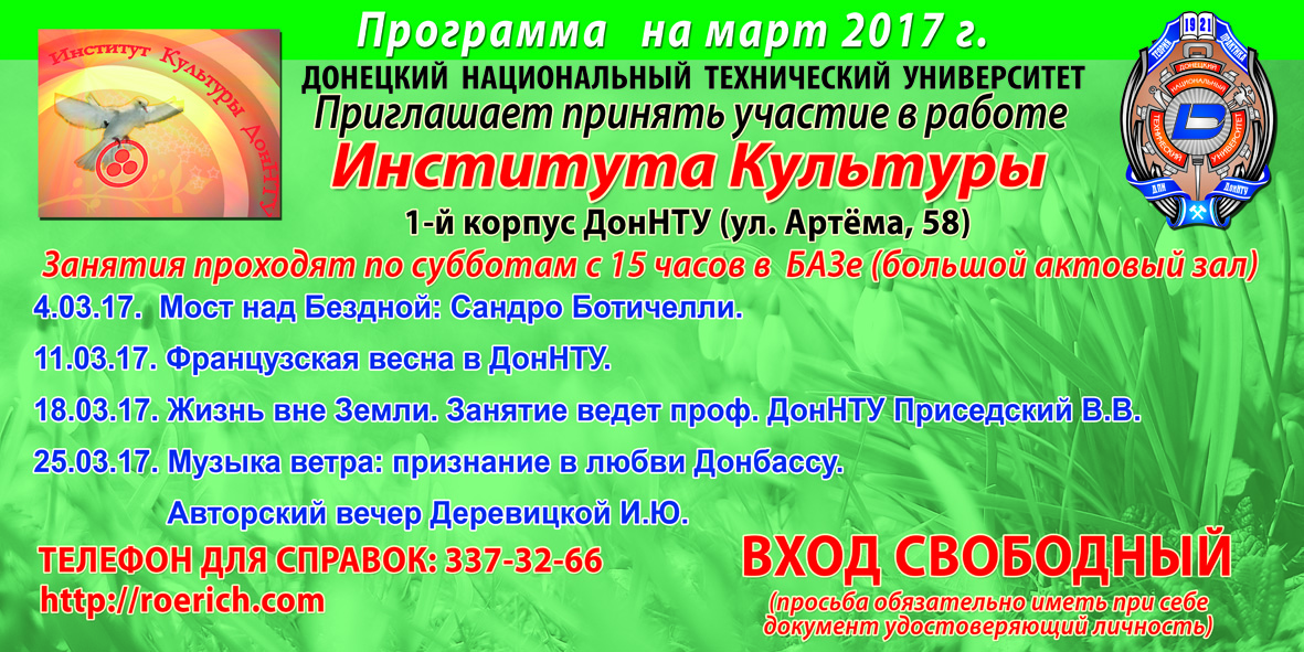 Институт культуры ДонНТУ является правопреемником Университета культуры ДонНТУ, который в свою очередь с 1959 года существовал в стенах тогда ДИИ. Организатором его тогда выступила Р.И.Ройтблат – энтузиаст и преданный идеалам просветительства человек. И вот в мае 2017 года исполняется 10 лет институту культуры ДонНТУ, который в новом составе работает в области расширения гуманитарных знания студентов и формирование гармонически развитой личности будущего инженера. По сути, это выполнение 1-ой миссии университета – культурной. На самом деле она – главная, ибо дает вектор развития техники и развитию самой цивилизации. Сотрудники института культуры сердечно благодарят всех сотрудников, участников, Руководство ВУЗа и саму Судьбу, которая дает такую возможность потрудиться во имя высоких идеалов просвещения. Институт культуры работает по 5 направлениям: - новые направления науки; - шедевры мировой живописи; - шедевры мирового кинематографа; - театральное направление; - музыкальное.