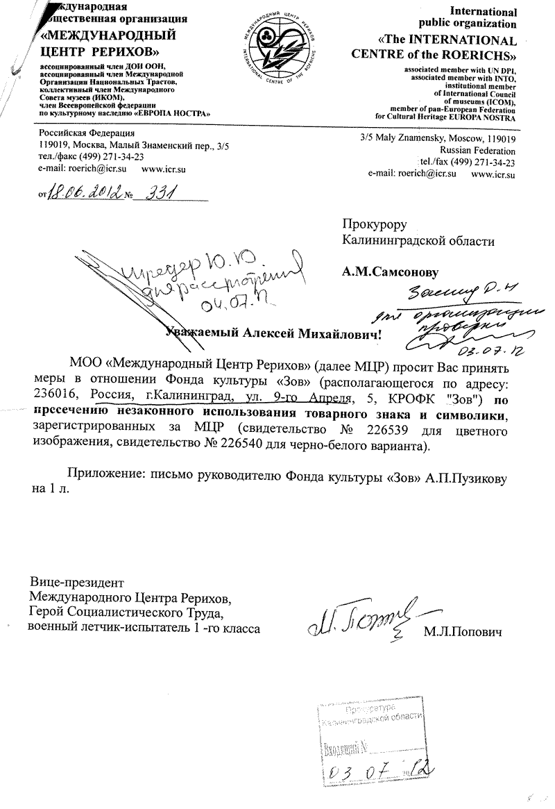 Живая Этика (Агни Йога), Теософия | | | Результаты поиска в Google | | | Результаты поиска по Агни Йоге | | | 20.05.2017, 23:29 | #241 | Рег-ция: 05.05.2006 Адрес: Москва Сообщения: 20,431 Благодарности: 818 Поблагодарили 2,419 раз(а) в 1,452 сообщениях | Ответ: Знамя Мира Цитата: Сообщение от Aletes Dar, я завидую Вашему оптимизму, насчет количества последователей! Но что-то мы отвлеклись от темы. Цитата для размышления. Цитата: | Грани 1952 г. 381. «Кольцо имеет силу, и немалую, и, конечно, как и всё, она требует осознания. Не в кольце дело, а в символе, на нем изображенном. Астральное отражение символа имеет мощь на видимом и невидимом плане. Печать Шамбалы связывает сознание с Шамбалой и служит символом соединения с Твердыней». | | Да, символ имеет силу, зависящую от сознания. Так же как крест или АУМ и т.д. Подборка по "знамени мира" из АЙ здесь __________________ Иерархия, 413 ... Мы оберегаем лишь на правильном пути. | | | | Этот пользователь сказал Спасибо Dar за это сообщение. | | 21.05.2017, 20:06 | #242 | | Administrator Рег-ция: 14.12.2002 Адрес: Москва Сообщения: 44,904 Благодарности: 1,988 Поблагодарили 7,069 раз(а) в 4,821 сообщениях | Ответ: Знамя Мира Цитата: Сообщение от Добрынин Цитата: Сообщение от Aletes МЦР, как правообладатель копирайта на Знамя Мира, взял на себя обязательства по его защите от неправомерного использования и даже добился переименования газеты "Знамя Мира". Почему же под носом МЦР в Москве много лет существует клуб "Крыша Мира" | Копирайт Знамени Мира не распространяется на названия ночных клубов, борделей, катеров, яхт, конфет и тысяч других возможных вариантов. Копирайт ограничивается небольшим перечнем объектов - в основном культурного назначения. Перечень обычно ограничивается критическими областями и наличием достаточных финансов для покрытия нужных областей копирайтом... | Именно опираясь на свой патент МЦР запрещало использование Знамени Мира ряду рериховских организаций, но не упоминаемому ночному клубу. | | | 21.05.2017, 20:18 | #243 | Рег-ция: 13.01.2003 Адрес: РФ Сообщения: 8,473 Благодарности: 1,121 Поблагодарили 1,580 раз(а) в 903 сообщениях | Ответ: Знамя Мира Цитата: Сообщение от Владимир Чернявский Цитата: Сообщение от Добрынин Цитата: Сообщение от Aletes МЦР, как правообладатель копирайта на Знамя Мира, взял на себя обязательства по его защите от неправомерного использования и даже добился переименования газеты "Знамя Мира". Почему же под носом МЦР в Москве много лет существует клуб "Крыша Мира" | Копирайт Знамени Мира не распространяется на названия ночных клубов, борделей, катеров, яхт, конфет и тысяч других возможных вариантов. Копирайт ограничивается небольшим перечнем объектов - в основном культурного назначения. Перечень обычно ограничивается критическими областями и наличием достаточных финансов для покрытия нужных областей копирайтом... | Именно опираясь на свой патент МЦР запрещало использование Знамени Мира ряду рериховских организаций, но не упоминаемому ночному клубу. | Владимир, а что вы лично предложите предпринять в защиту символа ЗМ в этом ночном клубе? __________________ "Всегда вперед и только ввысь!" | | | 21.05.2017, 20:37 | #244 | Рег-ция: 05.05.2006 Адрес: Москва Сообщения: 20,431 Благодарности: 818 Поблагодарили 2,419 раз(а) в 1,452 сообщениях | Ответ: Знамя Мира Цитата: Сообщение от Николай А. ..предложите предпринять в защиту символа ЗМ в этом ночном клубе? | (имхо) 1. Написать письмо Путину. ( я все же верю про настольную книгу) 2. Приложить у