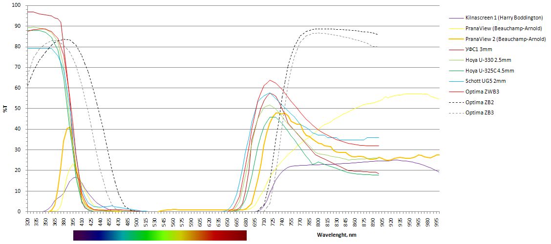 Живая Этика (Агни Йога), Теософия | | | Результаты поиска в Google | | | Результаты поиска по Агни Йоге | | | 16.05.2014, 03:53 | #361 | | Banned Рег-ция: 06.01.2009 Адрес: Восток-Запад Сообщения: 8,786 Благодарности: 704 Поблагодарили 2,355 раз(а) в 1,486 сообщениях | Ответ: Обсуждение книги Кильнера «The Human Atmosphere" Как объясняется такой влияющий фактор с позиции физики? | | | 10.06.2014, 02:05 | #362 | Рег-ция: 05.01.2013 Сообщения: 180 Благодарности: 17 Поблагодарили 7 раз(а) в 6 сообщениях | Ответ: Обсуждение книги Кильнера «The Human Atmosphere" Медленно, но работа продвигается. Решил сравнить UV стёкла и вот что получилось... (см. картинку) Самые доступные и недорогие - ZWB3, которые как-то здесь упоминались. Продаются на AliExpress и на Ebay. Правда, их стандартная форма - квадрат 50x50, но думаю можно договориться насчёт скругления, или решить вопрос своими силами... Пытался работать с эпоксидкой. О результатах пока говорить рано, но думаю, получить более-менее подходящий спектр вполне реально. При выборе компаунда следует учитывать вязкость (чем меньше, тем лучше), жизнеспособность (фаза жидкого состояния, до образования геля), спектральные характеристики (некоторые компаунды - жёлтые, гасят фиолетовый) и наличие добавок. Например, эластификатор Э - бесполезен, снижает "ёмкость" компаунда. При одинаковом количестве ТЭА с красителем, эластифицированный компаунд будет более пластичен. Ф - также бесполезная добавка ("отбеливающий" краситель Эпоксикон 400), 4% - аналогично снижает "ёмкость". М - добавка, улучшающая извлекаемость из формы. А вот это то что надо... Один из оптимальных вариантов - компаунд ПЭО-90М, он используется для изготовления светодиодов. Минусы - вязкость не самая маленькая, труднодоступен. Что касается кювет... Космофен (наверно, как и остальные цианоакрилатные клеи) совершенно не подходит. Гораздо лучше - та самая эпоксидка. Цитата: На Lfpti.ru (производитель компаунда) для склейки/герметизации (в том числе оптики) рекомендуются клеи/компаунды ПЭО-110К, ПЭО-113К, ПЭО-510К, ПЭО-513К, ПЭО-521К и некоторые другие... >>> Обладают хорошей смачиваемостью и высокой адгезией. В отвержденном состоянии не токсичны, пожаробезопасны, устойчивы к действию воды, спирта, бензина, разбавленных килот и щелочей, а также к механическим и температурным воздействиям. Применение - Склеивание стекла, фарфора, пластмасс, кожи, металла, дерева между собой и в различных сочетаниях, склеивание оптических элементов между собой и вклеивание их в оправы. | http://www.lfpti.ru - очень полезный сайт. Кстати, они выпускают интересный краситель ЭПОКСИКОН 445, но он не подходит - гасит красные лучи. Он довольно тёмный и его полоса пропускания очень узкая - подойдёт для других экспериментов по воздействию цвета, например, для спектрохромотерапии. Последний раз редактировалось Johnny, 10.06.2014 в 02:20. | | | 10.06.2014, 22:42 | #363 | Рег-ция: 05.01.2013 Сообщения: 180 Благодарности: 17 Поблагодарили 7 раз(а) в 6 сообщениях | Ответ: Обсуждение книги Кильнера «The Human Atmosphere" Цитата: Good afternoon. This is SASAKI from HOYA CANDEO Europe. I'm responsible for color filter sales in Europe. Thank you for asking us for U325C. The price for 2pcs of d=53(or 65) mm circle around 800USD per piece. Total amount will be 1,600USD. | Этот вариант отпадает. ZWB3 (2mm, 50x50 mm) вышли по 1500р за штуку. Продавец снял спектр. Последний раз редактировалось Johnny, 10.06.2014 в 22:46. | | | 11.06.2014, 15:10 | #364 | Рег-ция: 05.01.2013 Сообщения: 180 Благодарности: 17 Поблагодарили 7 раз(а) в 6 сообщениях | Ответ: Обсуждение книги Кильнера «The Human Atmosphere" Вот что получается... PV2=ZWB3+QB3+CR39 Толь