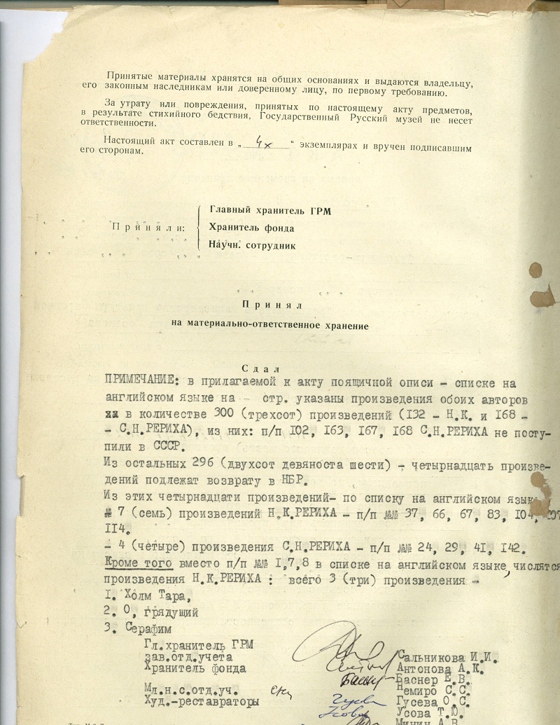 В том момент с Рерихом было две машинистки - С.Ю.Житенев и Л.В.Шапошникова. Кто из них? И заметьте, хотя было известно об ошибке в списках завещания, МЦР до последнего момента намерено утверждает, что картин должно быть 288.