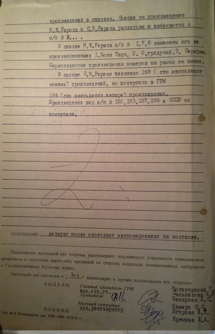 Мы располагаем копиями актов этих музеев по принятию и передаче 296 картин с соответствующими списками (например, см.: Прилож., док. 2). Во всех списках коллекция имеет в своем составе вышеупомянутые картины Н.К. Рериха — «Дева снегов» № 1, «Александр Невский» № 7, «Песнь о Шамбале» № 8.( В списке произведений Николая Константиновича Рериха сделан несколько другой перевод с английского языка названий картин под номерами 1 и 8 (См. Прилож., док. 2)). Таким образом, они остались в СССР, и в дальнейшем Святослав Николаевич включил их в свое завещание. http://www.icr.su/rus/protection/her...ruth/index.php