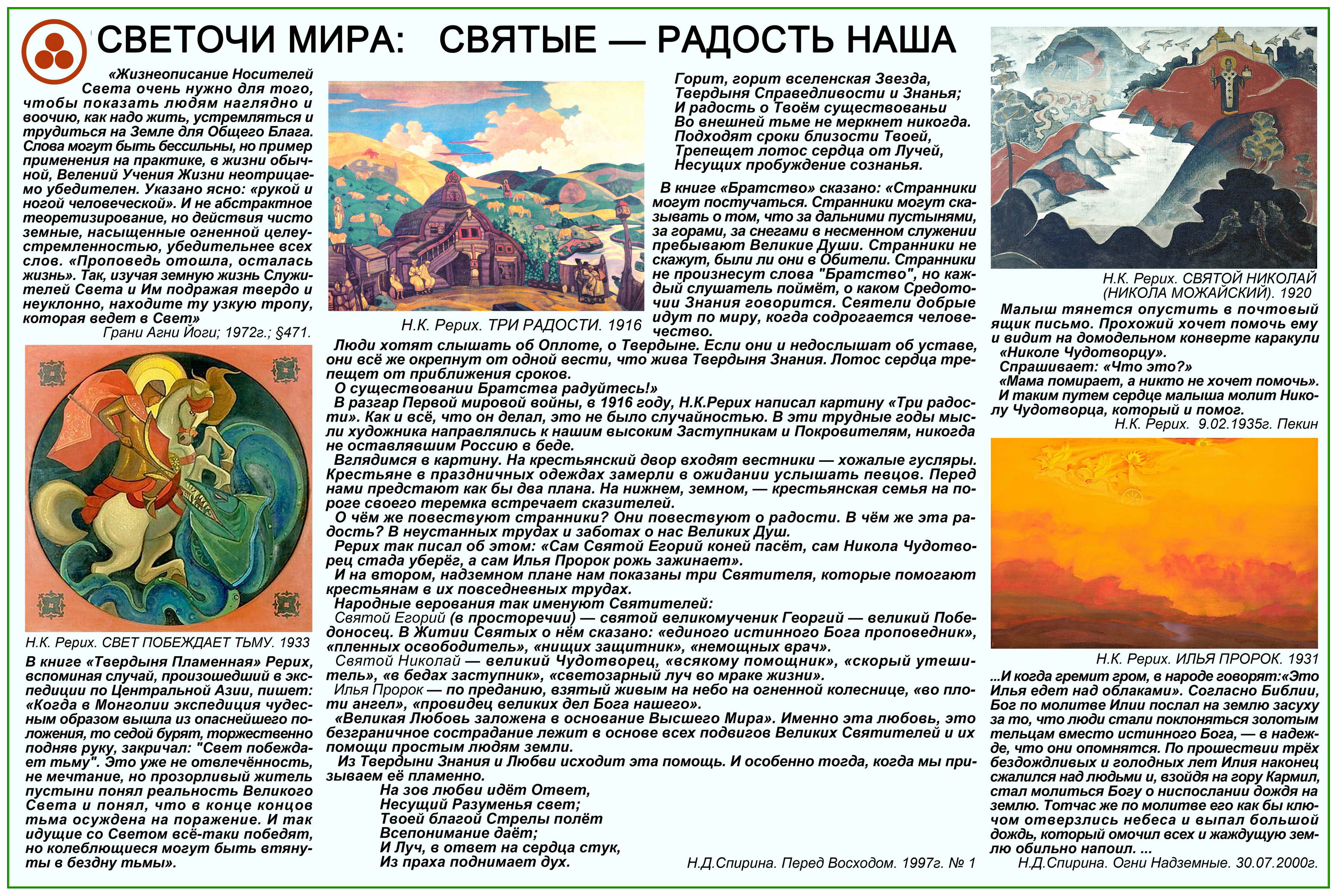 «Успешной может быть лишь та деятельность, которая отвечает внутренней сущности личности. И Рерих, который раскрывал понятие Культуры как культ Света, как почитание Света, и сам был таким светоносцем. И когда он писал о солнцеподобности Гёте, казалось, что он это писал и о себе. «Как-то особенно солнечно нужно праздновать память Гёте», — писал Рерих в статье, посвящённой этому гениальному писателю и философу. Так же солнечно нужно отмечать и дни памяти Н.К.Рериха, как мощного носителя Света и всесогревающего тепла — всему жизнь дающего, и ободряющего, и радостного» (Н.Д.Спирина, радиопередача «Николай Константинович Рерих», 24,31.10.1993г.).