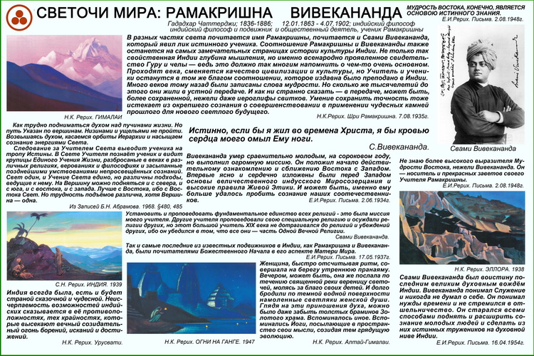 «В разных частях света почитается имя Рамакришны, почитается и Свами Вивекананда, который явил лик истинного ученика. Имена Рамакришны и Вивекананды, прославленной когорты их последователей, тоже останутся на самых замечательных страницах истории духовной культуры Индии. Не только так свойственная Индии глубина мышления, но именно всенародно проявленное свидетельство Гуру и челы – ведь это должно так многим напомнить о чем-то очень основном. Проходят века, сменяется качество цивилизации и культуры, но Учитель и ученики останутся в том же благом соотношении, которое издавна было преподано в Индии. Много веков тому назад были записаны слова мудрости. Но сколько же тысячелетий до этого они жили в устной передаче. И как ни странно сказать – в передаче, может быть более сохраненной, нежели даже иероглифы свитков. Умение сохранить точность тоже истекает из окрепшего сознания о совершенствовании в применении чудесных камней прошлого для нового светлого будущего» (Н.К.Рерих. Там же. Стр.60).