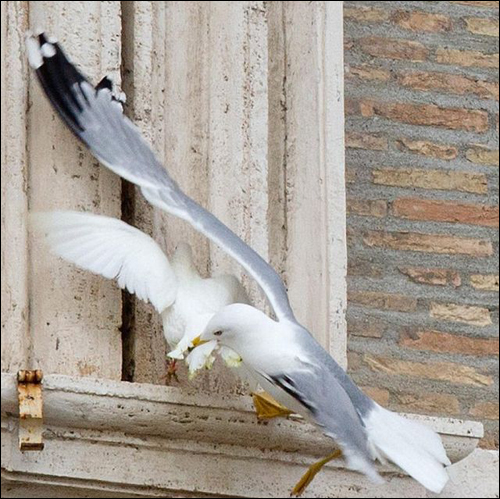 " 26.01.2014 Два голубя мира, выпущенные во время молитвы Папы Римского Франциска за мир на Украине, были тут же атакованы черной вороной и чайкой. Произошло это в воскресенье на глазах десятков тысяч людей, собравшихся на площади Святого Петра в Ватикане, чтобы послушать воскресный молебен папы. Во время молитвы за мир на Украине дети, стоявшие возле понтифика, выпустили в небо двух белых голубей мира. Тут же на птиц набросились черная ворона и большая чайка. Один голубь потерял перья, но быстро вырвался от чайки. А вот ворона долго преследовала другого голубя и периодически клевала его. "