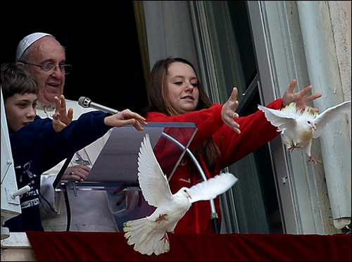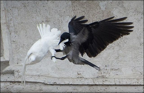 " 26.01.2014 Два голубя мира, выпущенные во время молитвы Папы Римского Франциска за мир на Украине, были тут же атакованы черной вороной и чайкой. Произошло это в воскресенье на глазах десятков тысяч людей, собравшихся на площади Святого Петра в Ватикане, чтобы послушать воскресный молебен папы. Во время молитвы за мир на Украине дети, стоявшие возле понтифика, выпустили в небо двух белых голубей мира. Тут же на птиц набросились черная ворона и большая чайка. Один голубь потерял перья, но быстро вырвался от чайки. А вот ворона долго преследовала другого голубя и периодически клевала его. "