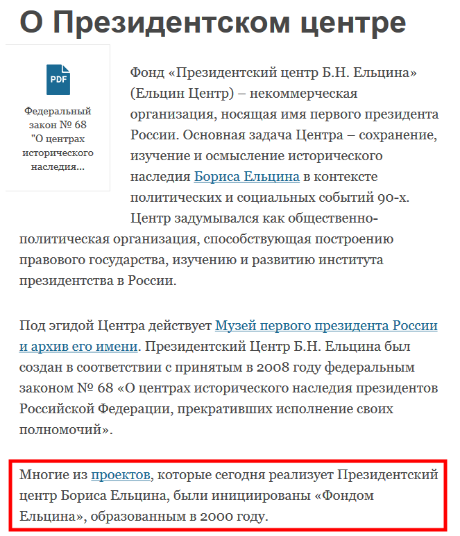 Устав был утвержден 2/12/2008, спустя пол года после принятия закона о центрах. А еще раньше, в 2000 году, по распоряжению самого Ельцина был создан Фонд Ельцина под управлением его дочери. Чем занимается фонд думаю слышали. Можете рассказать что-нибудь подобное о Путине?