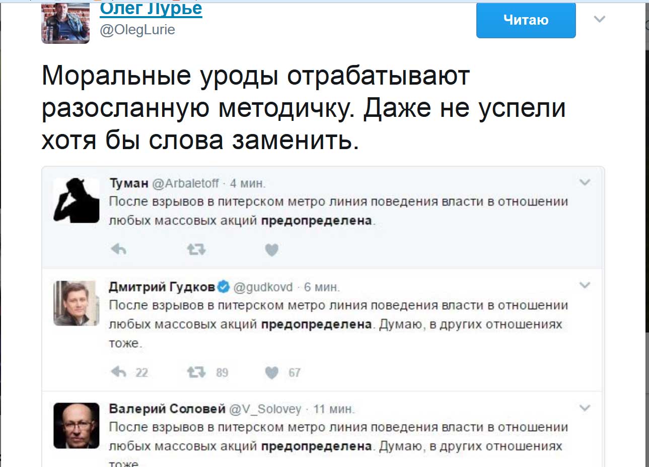 Живая Этика (Агни Йога), Теософия | | | Результаты поиска в Google | | | Результаты поиска по Агни Йоге | | | 22.02.2014, 01:24 | #1 | Рег-ция: 19.01.2005 Сообщения: 34,121 Благодарности: 15,295 Поблагодарили 3,612 раз(а) в 2,584 сообщениях | Россия и мир __________________ Сохраняйте душевный свет. Вопреки всему, не смотря ни на что. Это свет, по которому вас найдут такие же светлые души. Последний раз редактировалось Владимир Чернявский, 25.05.2015 в 21:15. | | | | Эти 4 пользователя(ей) сказали Спасибо Ardens за это сообщение. | | 03.04.2017, 18:38 | #15201 | Рег-ция: 17.11.2006 Адрес: Балашиха Московской области Сообщения: 8,282 Благодарности: 4,212 Поблагодарили 1,831 раз(а) в 1,125 сообщениях | Ответ: Россия и мир Нет информации. Нет и мыслей. А за домыслами надо идти в другое место. | | | 03.04.2017, 18:43 | #15202 | Рег-ция: 22.02.2007 Сообщения: 20,421 Благодарности: 61 Поблагодарили 5,181 раз(а) в 3,587 сообщениях | Ответ: Россия и мир Цитата: Сообщение от Живой Цитата: Сообщение от gog "Путину" | А мысли будут? | Это я предугадал ваши мусли __________________ "Чем ближе к Солнцу,тем ближе к Истине" Александр Чижевский | | | 03.04.2017, 18:51 | #15203 | | Banned Рег-ция: 22.02.2007 Сообщения: 230 Благодарности: 12 Поблагодарили 28 раз(а) в 17 сообщениях | Ответ: Россия и мир Цитата: Сообщение от Дамин Нет информации. Нет и мыслей. А за домыслами надо идти в другое место. | Что значит нет информации? Считаете, что терракт - постановка? | | | 03.04.2017, 18:53 | #15204 | | Banned Рег-ция: 22.02.2007 Сообщения: 230 Благодарности: 12 Поблагодарили 28 раз(а) в 17 сообщениях | Ответ: Россия и мир Цитата: Сообщение от gog Это я предугадал ваши мусли | Мимо и с опечаткой. Какие есть собственные мысли? | | | 03.04.2017, 18:53 | #15205 | Рег-ция: 22.02.2007 Сообщения: 20,421 Благодарности: 61 Поблагодарили 5,181 раз(а) в 3,587 сообщениях | Ответ: Россия и мир Цитата: Сообщение от gog | Украинцы в соцсетях набросились на Климкина, выразившего соболезнования в связи с терактом в Санкт-Петербурге https://www.rusdialog.ru/news/102397_1491233257 … __________________ "Чем ближе к Солнцу,тем ближе к Истине" Александр Чижевский | | | 03.04.2017, 18:53 | #15206 | Рег-ция: 22.02.2007 Сообщения: 20,421 Благодарности: 61 Поблагодарили 5,181 раз(а) в 3,587 сообщениях | Ответ: Россия и мир Цитата: Сообщение от Живой Цитата: Сообщение от gog Это я предугадал ваши мусли | Мимо и с опечаткой. Какие есть собственные мысли? | Это не опечатка-это намеренно __________________ "Чем ближе к Солнцу,тем ближе к Истине" Александр Чижевский | | | 03.04.2017, 18:55 | #15207 | | Banned Рег-ция: 22.02.2007 Сообщения: 230 Благодарности: 12 Поблагодарили 28 раз(а) в 17 сообщениях | Ответ: Россия и мир Цитата: | Это не опечатка-это намеренно | Прощаю, не переживайте. Так какие собственные мысли? Или ещё не думали? | | | 03.04.2017, 19:01 | #15208 | Рег-ция: 22.02.2007 Сообщения: 20,421 Благодарности: 61 Поблагодарили 5,181 раз(а) в 3,587 сообщениях | Ответ: Россия и мир Цитата: Сообщение от Живой Цитата: | Это не опечатка-это намеренно | Прощаю, не переживайте. Так какие собственные мысли? Или ещё не думали? | Какие могут быть мысли? Пока только факт теракта. Остальное будут только домыслами. Вот фото предполагаемого организатора:  __________________ "Чем ближе к Солнцу,тем ближе к Истине" Александр Чижевский Последний раз редактировалось gog, 03.04.2017 в 19:03. | | | 03.04.2017, 19:11 | #15209 | Рег-ция: 04.11.2006 Адрес: ВОРОНЕЖ Сообщения: 3,368 Благодарности: 163 Поблагодарили 853 раз(а) в 524 сообщениях | Ответ: Россия и мир Цитата: Сообщение от Дамин Может быть это не проблема государственного масштаба, но для конкретного старика (старухи) это настоящая трагедия особенно если человек честно трудился. | п