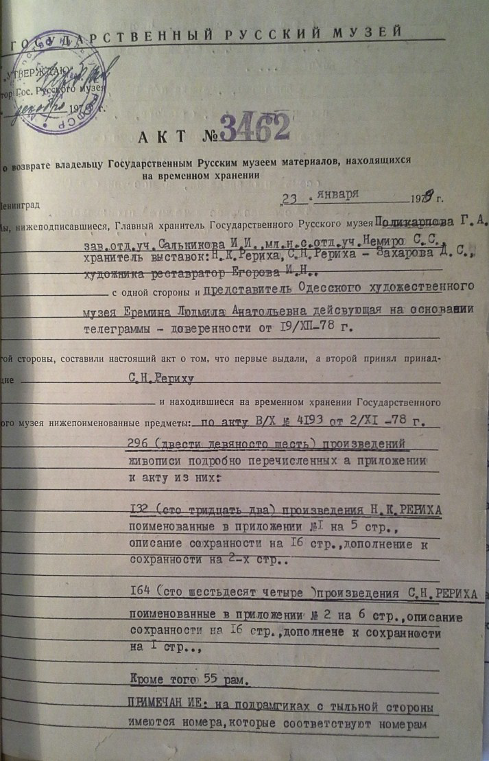 Мы располагаем копиями актов этих музеев по принятию и передаче 296 картин с соответствующими списками (например, см.: Прилож., док. 2). Во всех списках коллекция имеет в своем составе вышеупомянутые картины Н.К. Рериха — «Дева снегов» № 1, «Александр Невский» № 7, «Песнь о Шамбале» № 8.( В списке произведений Николая Константиновича Рериха сделан несколько другой перевод с английского языка названий картин под номерами 1 и 8 (См. Прилож., док. 2)). Таким образом, они остались в СССР, и в дальнейшем Святослав Николаевич включил их в свое завещание. http://www.icr.su/rus/protection/her...ruth/index.php