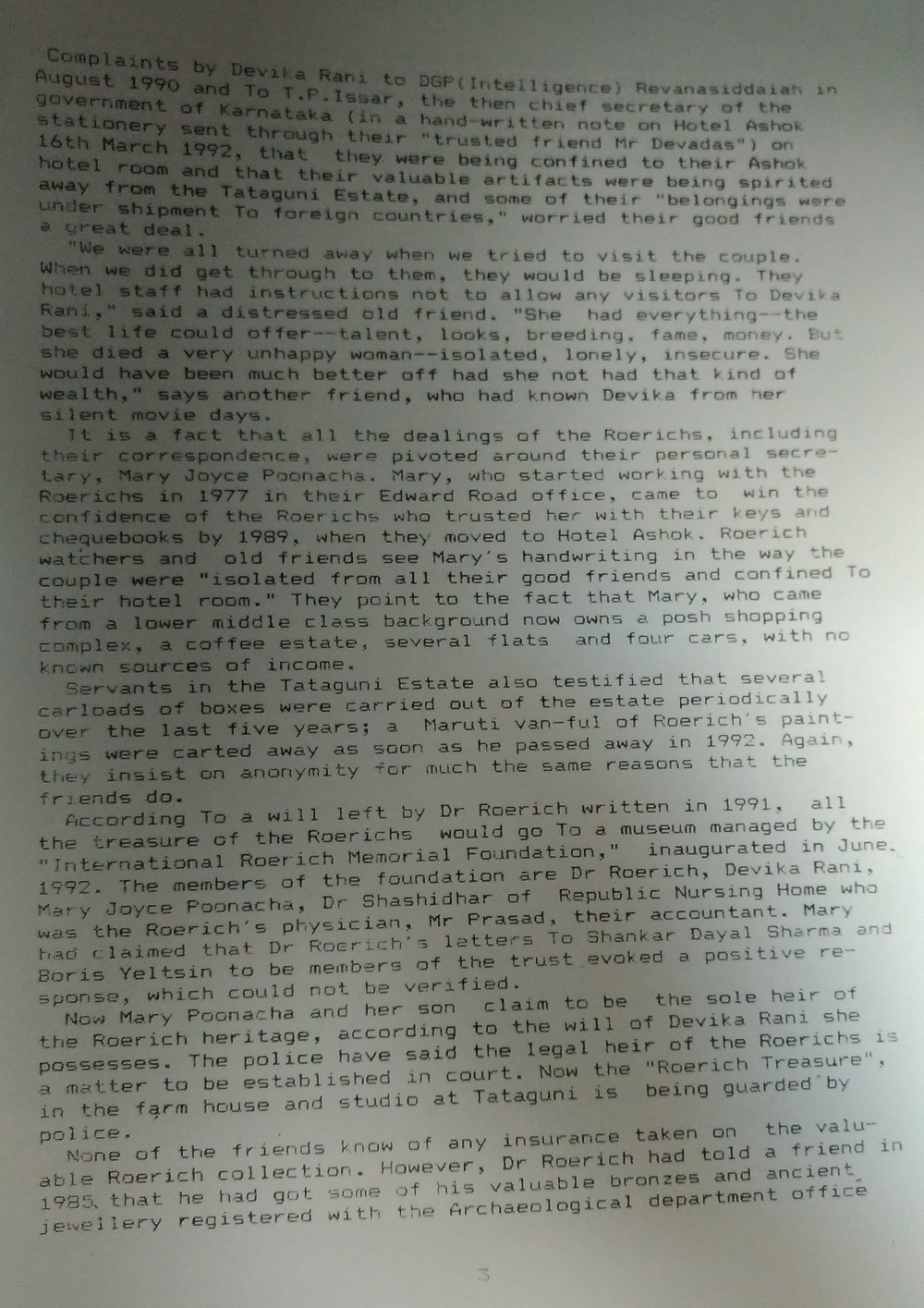 Живая Этика (Агни Йога), Теософия | | | Результаты поиска в Google | | Результаты поиска по Агни Йоге | | 22.11.2017, 23:40 | #10361 | Рег-ция: 28.11.2002 Адрес: Deutschland Сообщения: 2,182 Благодарности: 4 Поблагодарили 96 раз(а) в 62 сообщениях | Ответ: Ситуация в МЦР Цитата: Сообщение от Владимир Чернявский Согласно его завещанию, после его смерти вся его собственность должна была перейти Тресту Рерихов. | Укажите, пожалуйста, источник этой информации. | | | 23.11.2017, 07:39 | #10362 | Administrator Рег-ция: 14.12.2002 Адрес: Москва Сообщения: 44,904 Благодарности: 1,988 Поблагодарили 7,069 раз(а) в 4,821 сообщениях | Ответ: Ситуация в МЦР Цитата: Сообщение от Andrej Цитата: Сообщение от Владимир Чернявский Согласно его завещанию, после его смерти вся его собственность должна была перейти Тресту Рерихов. | Укажите, пожалуйста, источник этой информации. | Мне казалось, что это общеизвестно. Я не однократно встречал это утверждение в индийской прессе. К примеру, у меня есть выписки из интервью с П.Кодандарамая (комиссаром полиции г.Бангалора), в котором он говорит про завещания: Цитата: Доктор Святослав Рерих и Девика Рани составили завещание 10 апреля 1992 г. В тот же самый день они оба составили акт, касающийся треста. Согласно этим трем документам, вся собственность переходила к тресту. Ничего не переходило к частным лицам. Они учредили трест с несколькими попечителями. Г-жа Пунача один из них. Это означает, что Доктор Рерих на протяжении своей жизни никогда и в мыслях не имел намерения что-либо из своей собственности передавать частному лицу, ни часть поместья Татагуни, ни целиком. Манипулировала только Девика Рани. Все началось с первого завещания от 7 июля 1990 г. согласно которому определенная отходила к сыну Мери Пунача, а 25 акров художнику во дворце Оркард, и 15 акров вокруг дома в Татагуни - художественной галерее. Остальная часть могла быть продана при необходимости, но только ради треста и для процветания музея. Согласно тому завещанию, она распорядилась всей землей, за исключением здания, в размере 40 акров, и назначила Девадаса и его сына Джуда Даякарана душеприказчиками для. распоряжения оставшейся собственности и использованию её музеем Рериха, к которому и должны были отойти те самые 40 акров. Но и эта земля не могла быть продана при жизни Доктора Рериха. Даже согласно этому завещанию, ничто не могло перейти в частные руки. | Последний раз редактировалось Владимир Чернявский, 23.11.2017 в 07:47. | | | 23.11.2017, 07:42 | #10363 | Рег-ция: 16.12.2003 Адрес: Новосибирск Сообщения: 12,352 Благодарности: 3,008 Поблагодарили 3,285 раз(а) в 1,982 сообщениях | Ответ: Ситуация в МЦР Цитата: Сообщение от paritratar Почему-то участники форума промолчали на эту откровенную клевету. Как можно терпеть таковые оскорбления и обвинения? | Но вы же написали, я тоже напомнил о цене некоторых ошибок. Нет смысла в эмоциональных реакциях, часто почти невозможно переубедить даже несмотря на факты. Сколько раз в форуме отрицались очевидные факты, приходилось доказывать очевидные вещи/трюизмы? Цитата: Паритратар уверен в безукоризненности С.Н. Рериха на основе фактов, которые уже сейчас в достаточном количестве предоставлены вами же. | Да, всё так, но ситуация вокруг С.Н. в последние годы была очень сложная, поэтому она очень сложна для понимания многими, привыкшими мыслить совсем прямолинейно и неосведомлённых о некоторых фактах. Зато постепенно всплывают исторические доку
