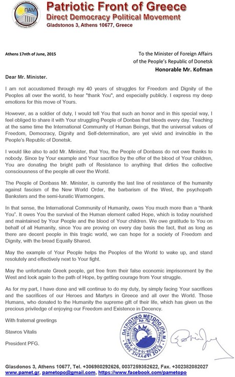 На днях Министр иностранных дел Донецкой Народной Республики Александр Кофман написал официальное благодарственное письмо, адресованное представителям общественности Греции. От имени народа Донбасса он выразил признательность Патриотическому Фронту Греции и его Президенту, господину Ставросу Виталису. Это редкое и необычное явление в международных отношениях.
