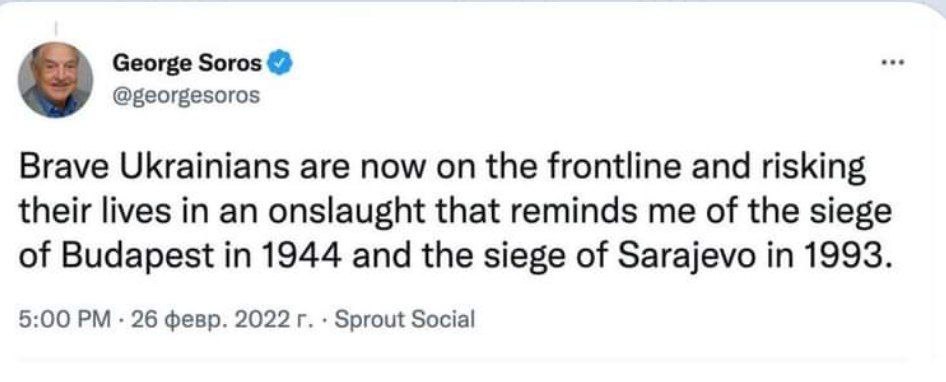 Джордж Сорос в своём Твиттере все расставил по местам. Молодец. Украинские войска он назвал такими же храбрыми, как и войска Вермахта, оборонявшие Будапешт от наступления Советской Армии.